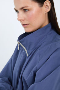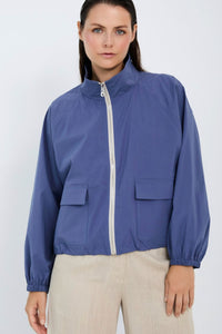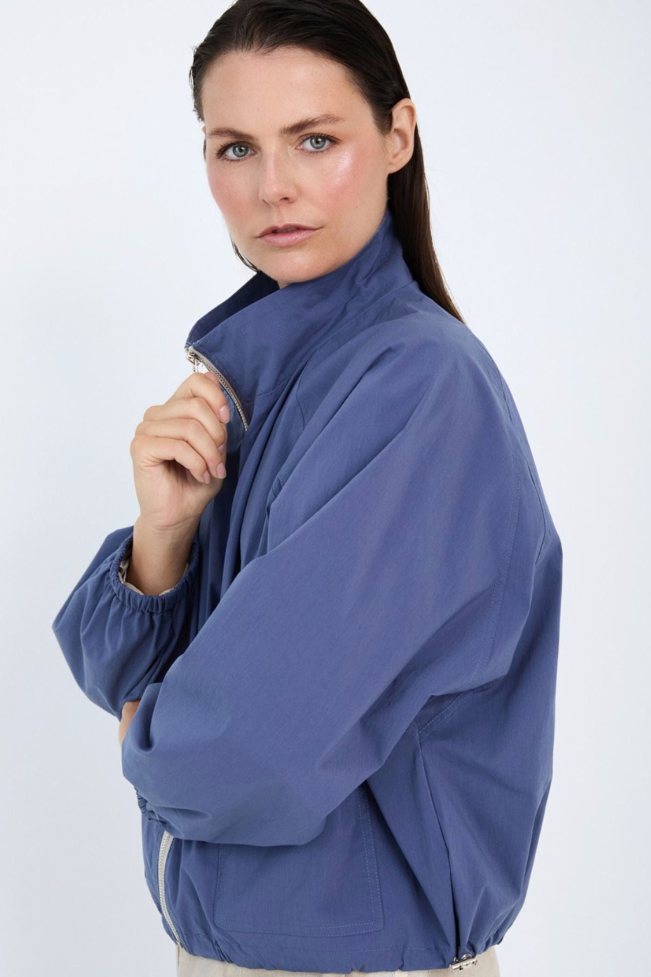 Cropped technical fabric jacket with a luxe viscose blend for effortless style and comfort. Features a sharp stand collar, long sleeves with elastic cuffs, and a sleek front zipper closure. Two front flap pockets offer practical storage. The elasticated hem creates a refined silhouette, while the lined interior ensures durability and a polished finish. Perfect for layering or wearing solo.