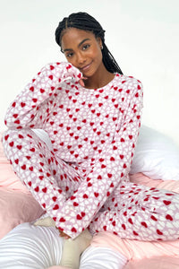 Snuggle up in style with the Candy Heart Marna Waffle PJ Set—your new favorite excuse to stay cozy all day long. This adorable two-piece features a dimensional waffle texture that's been super brushed for cloud-like softness you'll absolutely love. The set includes a relaxed boxy long-sleeve top paired with matching drawstring joggers, creating the perfect head-to-toe comfort combo. Whether you're lounging at home or catching some well-deserved downtime, this playful all-over print set delivers both cuteness and coziness in one irresistible package.