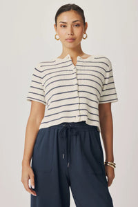Effortless layering meets coastal charm with the Delilah Cardigan. This cropped, boxy knit features airy fabric that breathes beautifully over dresses or pairs casually with your favorite jeans. Navy contrast stripes deliver nautical flair without trying too hard. Short sleeves and a relaxed silhouette make it the go-to piece for transitional weather—throw it on and feel instantly put-together.