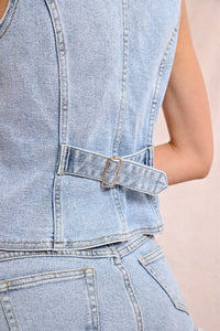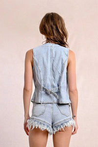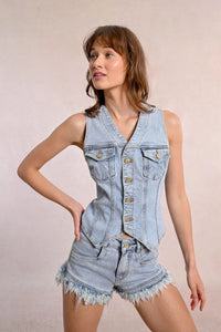 Rock your casual look with the Ella Vest, a sleeveless denim jacket that's all about the fun details! The flirty V neckline frames your face while cheeky side cutouts add unexpected pizzazz. With handy chest flap pockets and a figure-hugging slim fit, this vest means business—but the contrasting button closure down the front says "party time!" Perfect for layering or stealing the spotlight all on its own!