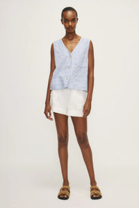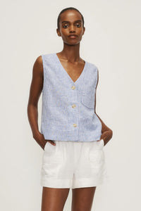 The Linden Vest elevates your style with its sophisticated linen-cotton blend construction. Its timeless stripe pattern creates a versatile piece that transitions effortlessly from casual to refined occasions. The classic button-front closure and practical chest pocket don't just add visual interest—they make this vest the functional, fashionable layer your wardrobe has been missing. An investment piece that will quickly become your go-to for polished, effortless style.