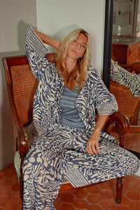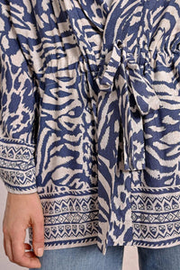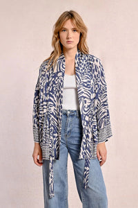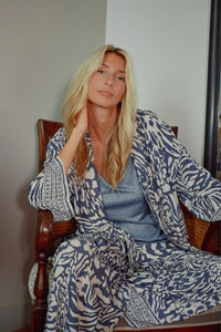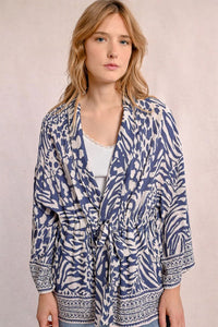 Elevate your wardrobe with our stunning Maggy Kimono featuring an eye-catching zebra print. The long flared sleeves create a dramatic silhouette while the elegant shawl collar adds sophistication to this versatile piece. Designed with a convenient tie at the waist, this marked-size kimono allows for a customized fit that flatters your figure. Perfect for layering over basics or as a statement piece for special occasions.