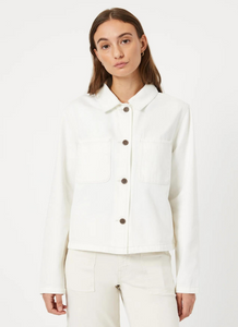 A denim jacket built for summer nights, this stunner is made with breathable and lightweight bamboo. An off-white wash, biodegradable nutshell buttons, and front pockets are chic details on a classic style.