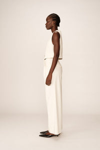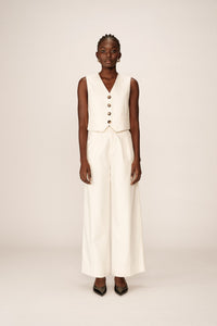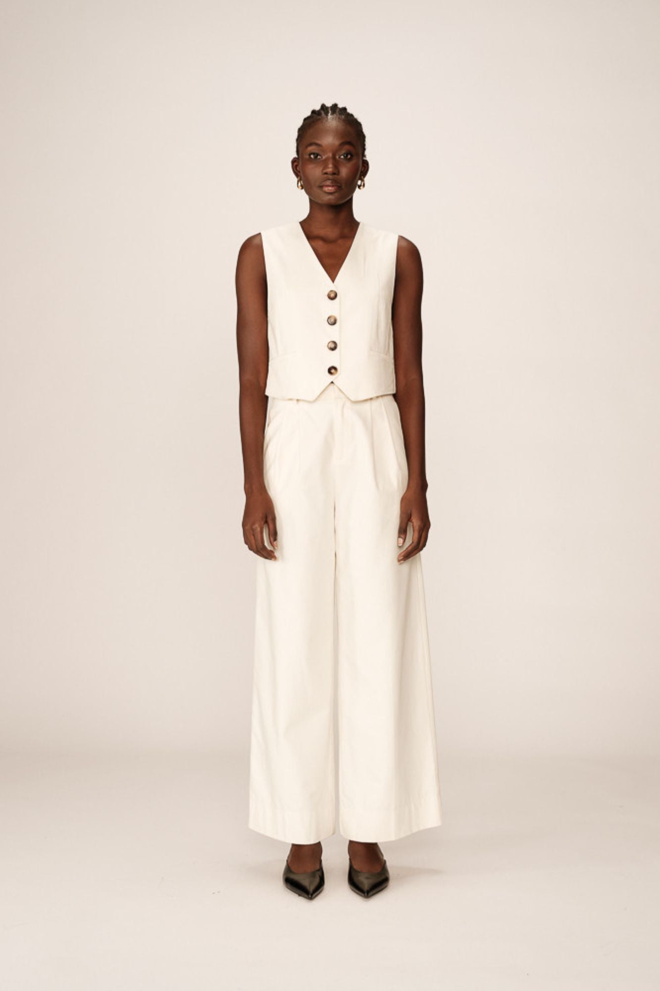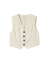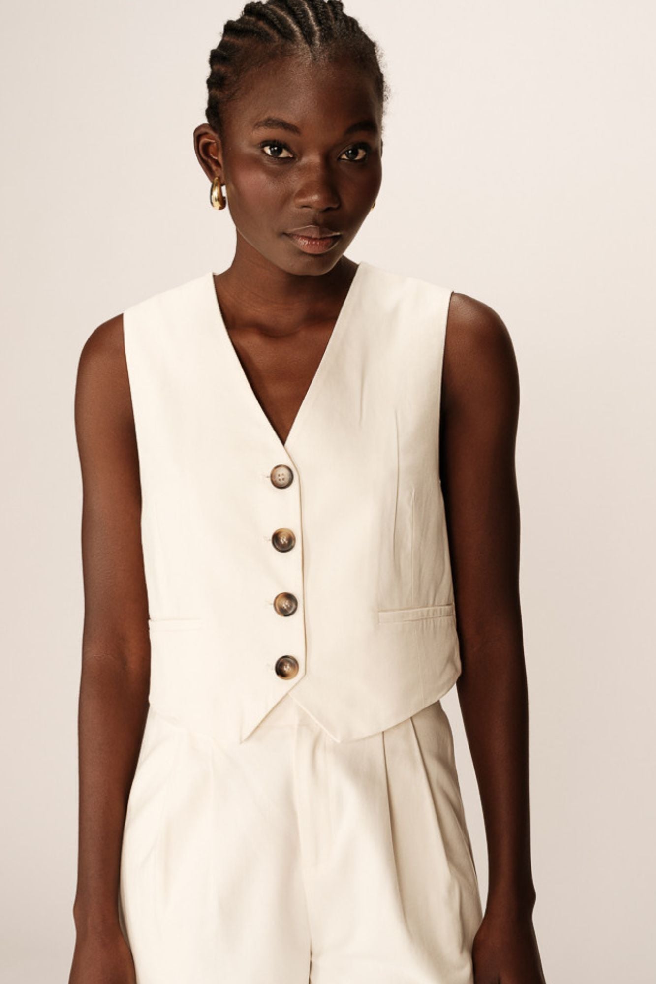 The Penn sleeveless vest boasts a sleek, tailored design and a flattering V-neckline that accentuates feminine curves. Carefully crafted with a button placket and faux piped pockets, this chic and sophisticated piece exudes elegance. Elevate your wardrobe with this minimalist must-have.