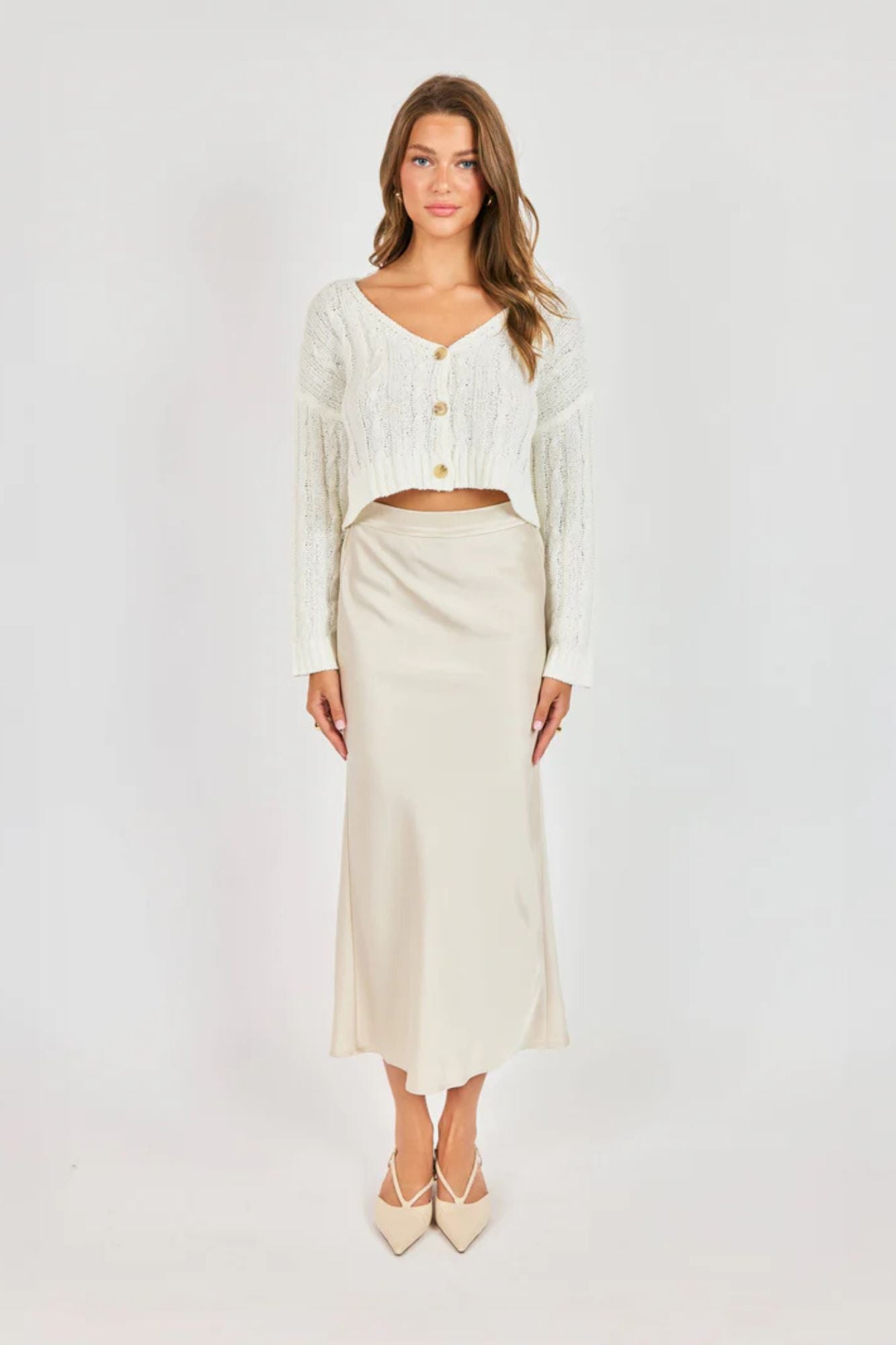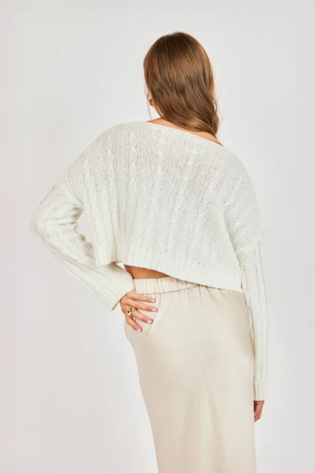 This charming white cardigan blends classic knit textures with modern sophistication. The soft, relaxed fit pairs beautifully with high-waisted silks and satins for an effortless layered look. Featuring tonal marbled buttons, a flattering V-neckline with dropped shoulders, and a cropped ribbed hem that hits at the natural waist, this piece delivers timeless style with contemporary edge. Perfect for creating versatile, polished outfits.