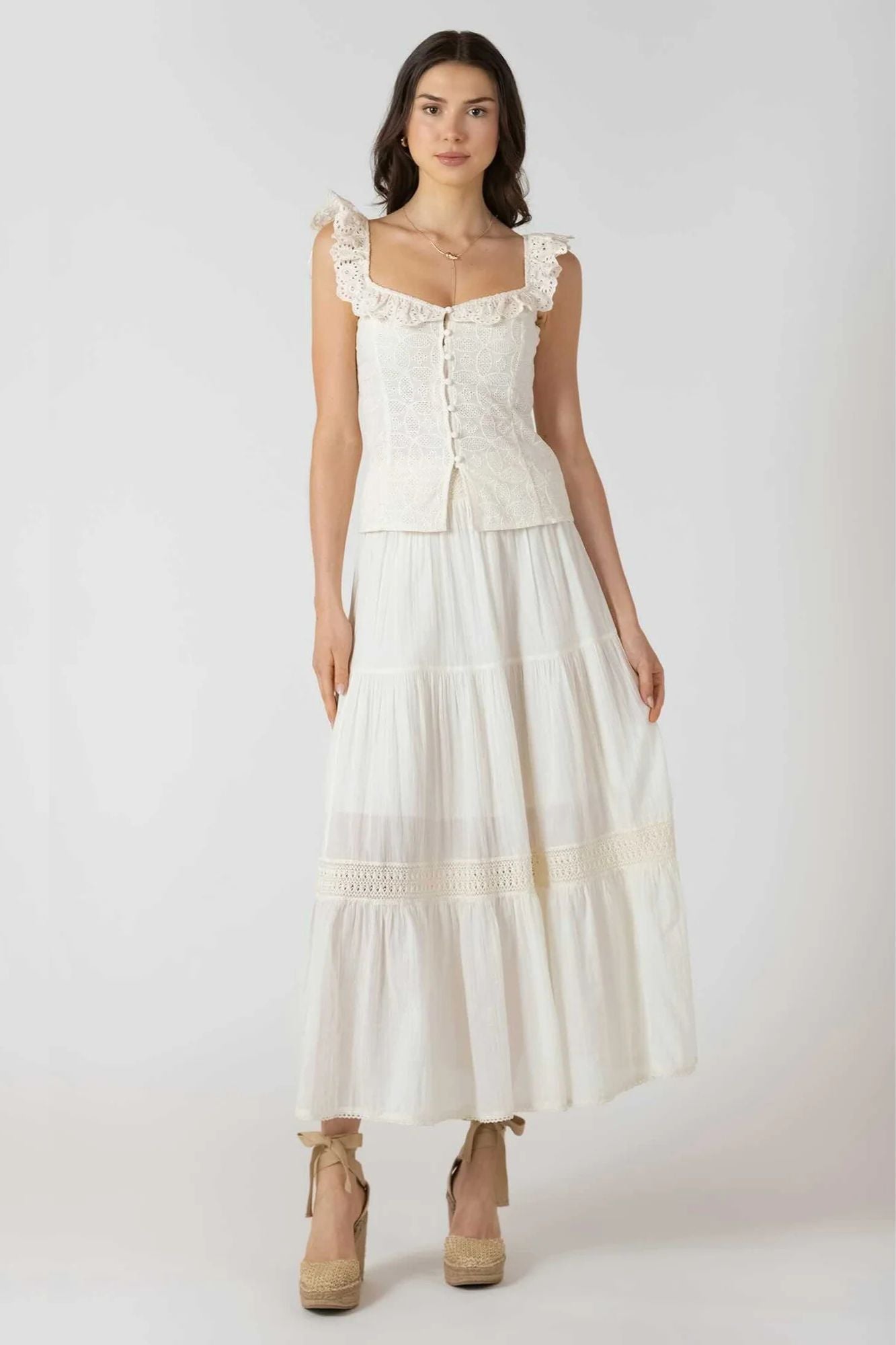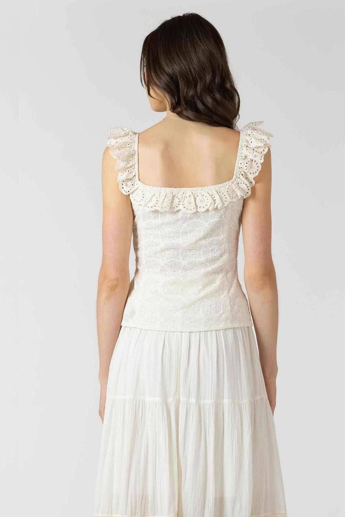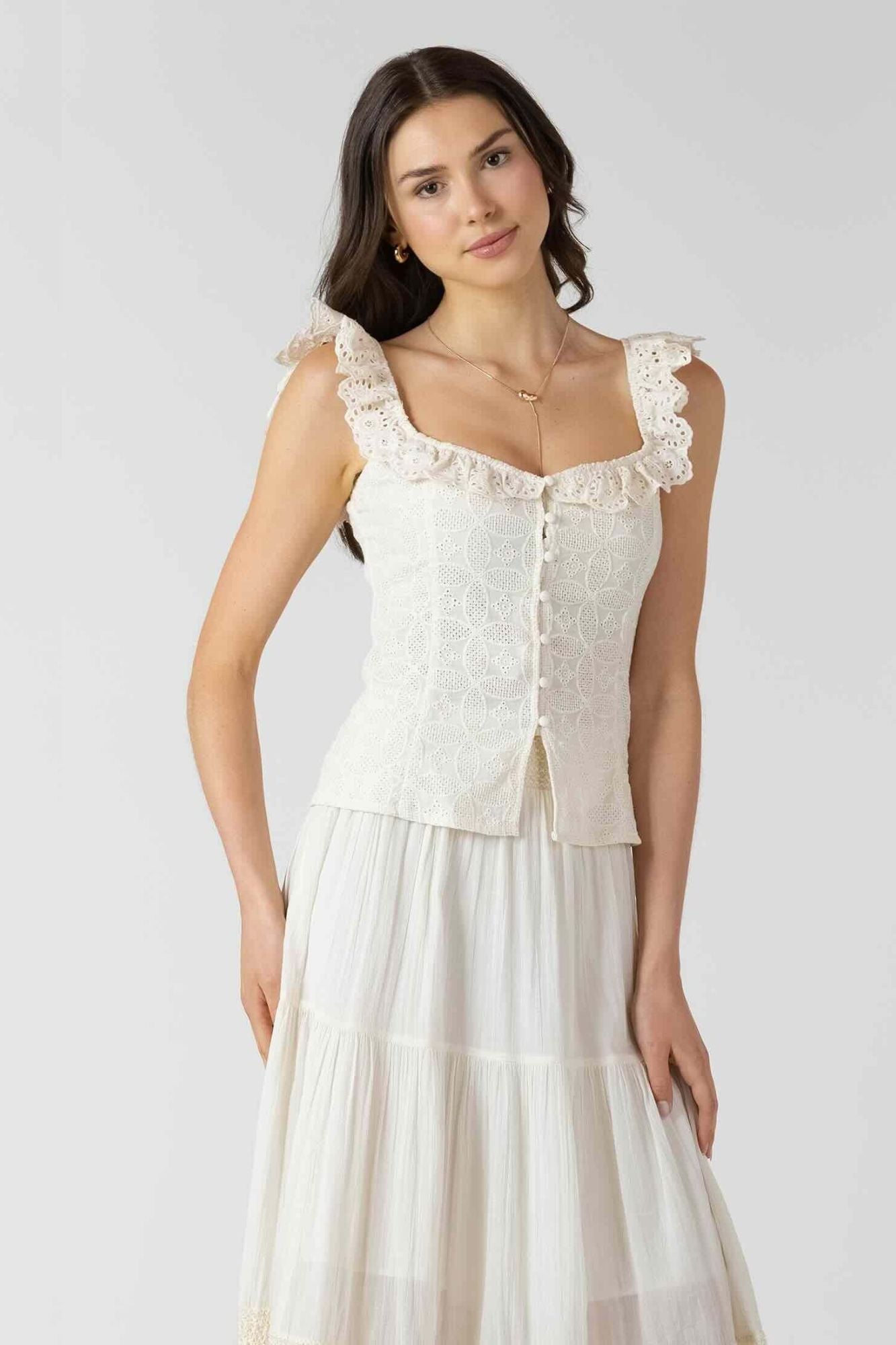 The Button Front Eyelet Tank is a versatile wardrobe staple that effortlessly transitions from office to weekend. Featuring a classic button front placket and delicate eyelet detailing, this tank combines understated elegance with everyday comfort. The refined silhouette works beautifully layered or worn solo, making it an essential piece for any season.