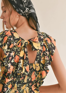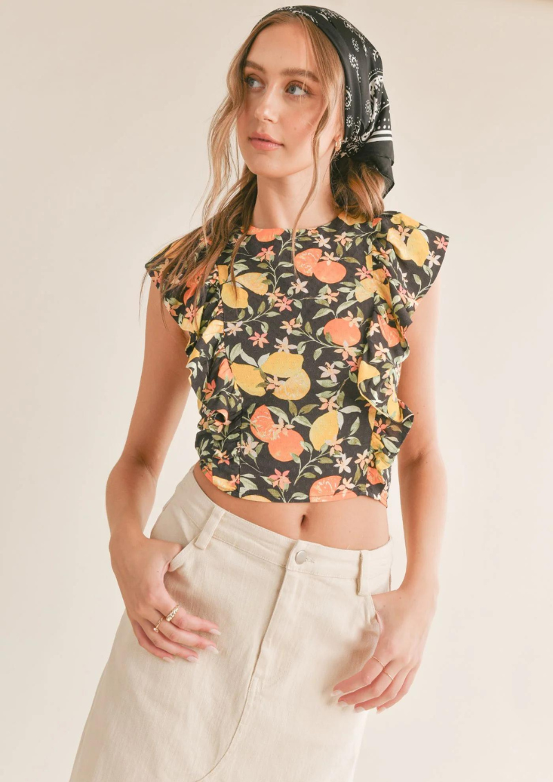 Unleash your playful side with the Fruitful Ruffle Top! This scoop neck blouse features ruffle sleeves and a smocked back for a flattering fit. The open back with adjustable tie adds a touch of flirtiness, while the all-over fruit and floral pattern adds a fun twist. With its cropped length, this top is perfect for showing off your unique style!