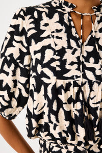 Get ready to make a statement with the Nellie Top! This playful blouse features an allover print and a trendy V-neck with a tie detail at the neck. Made with 100% viscose, it offers a relaxed fit for all-day comfort. A must-have item this season for those who like to stay stylish and comfortable.