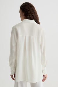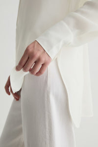 The Sawtelle Shirt is a long-sleeve blouse that combines effortless elegance with modern design. Crafted from our luxurious Matt Crepe Silk, it features a fluid, relaxed fit that drapes beautifully against the body. Pearlescent buttons accent the front placket and cuffs, while a refined pointed collar adds polish. The high-low hem delivers contemporary flair. Available in our soft Powder wash, this piece transitions seamlessly from day to evening.