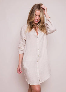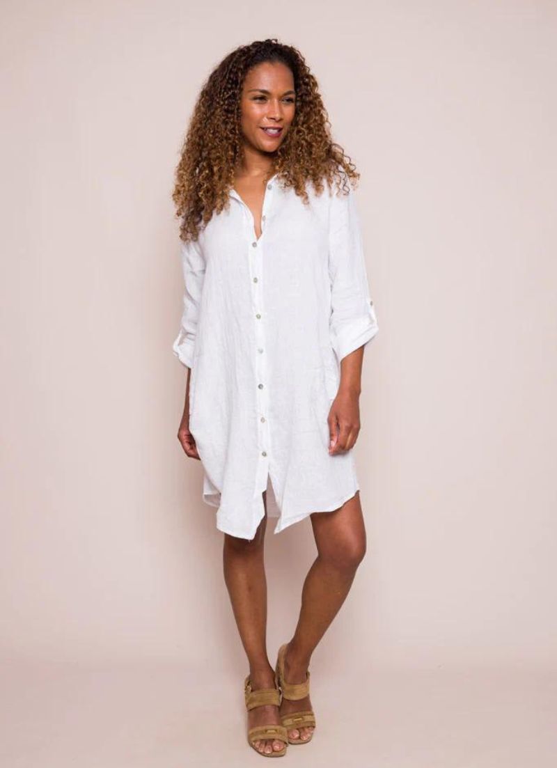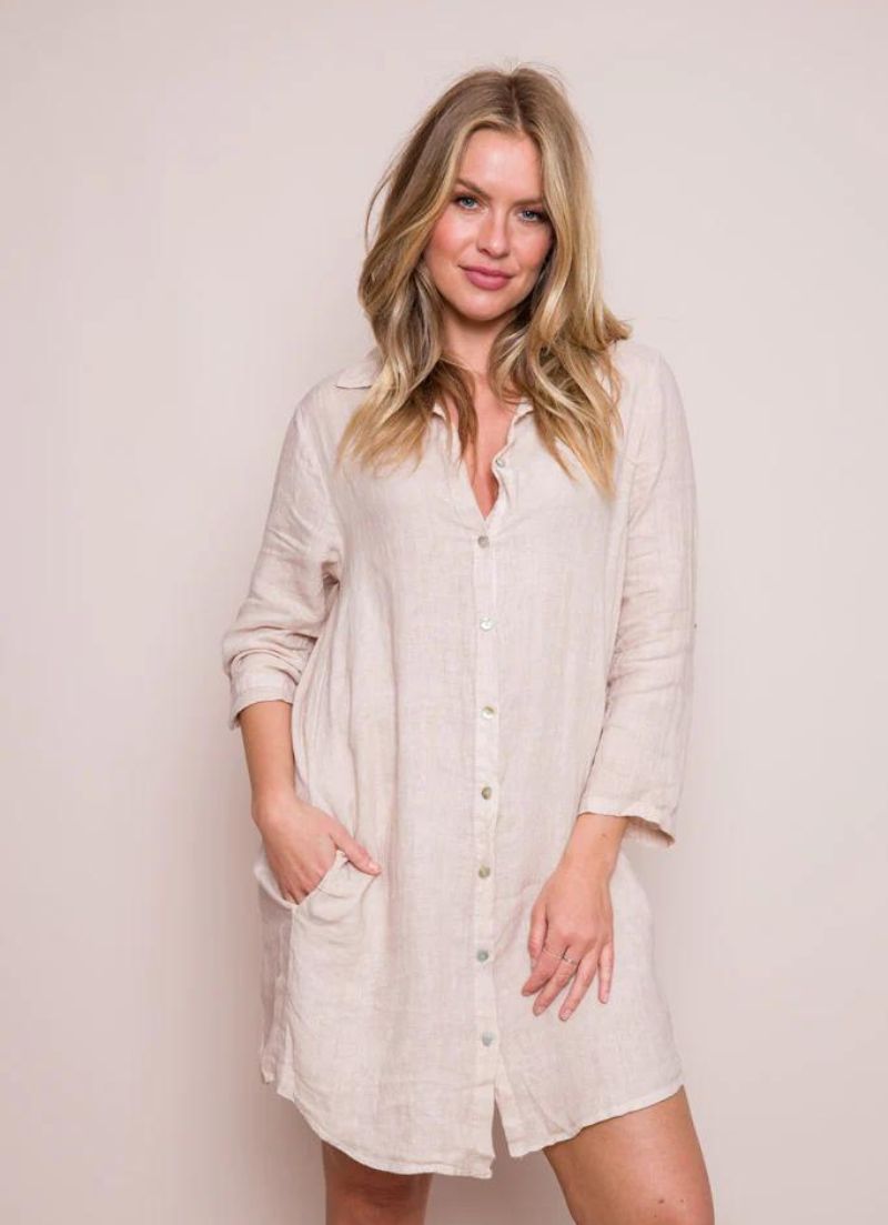 Tuck it in, leave it out, throw on over a bikini, wear with heels - you pick with Simone, she’s so versatile! This light and airy shirt dress is crafted from linen, featuring turned up sleeves, concealed side pockets and a pearlescent button closure.