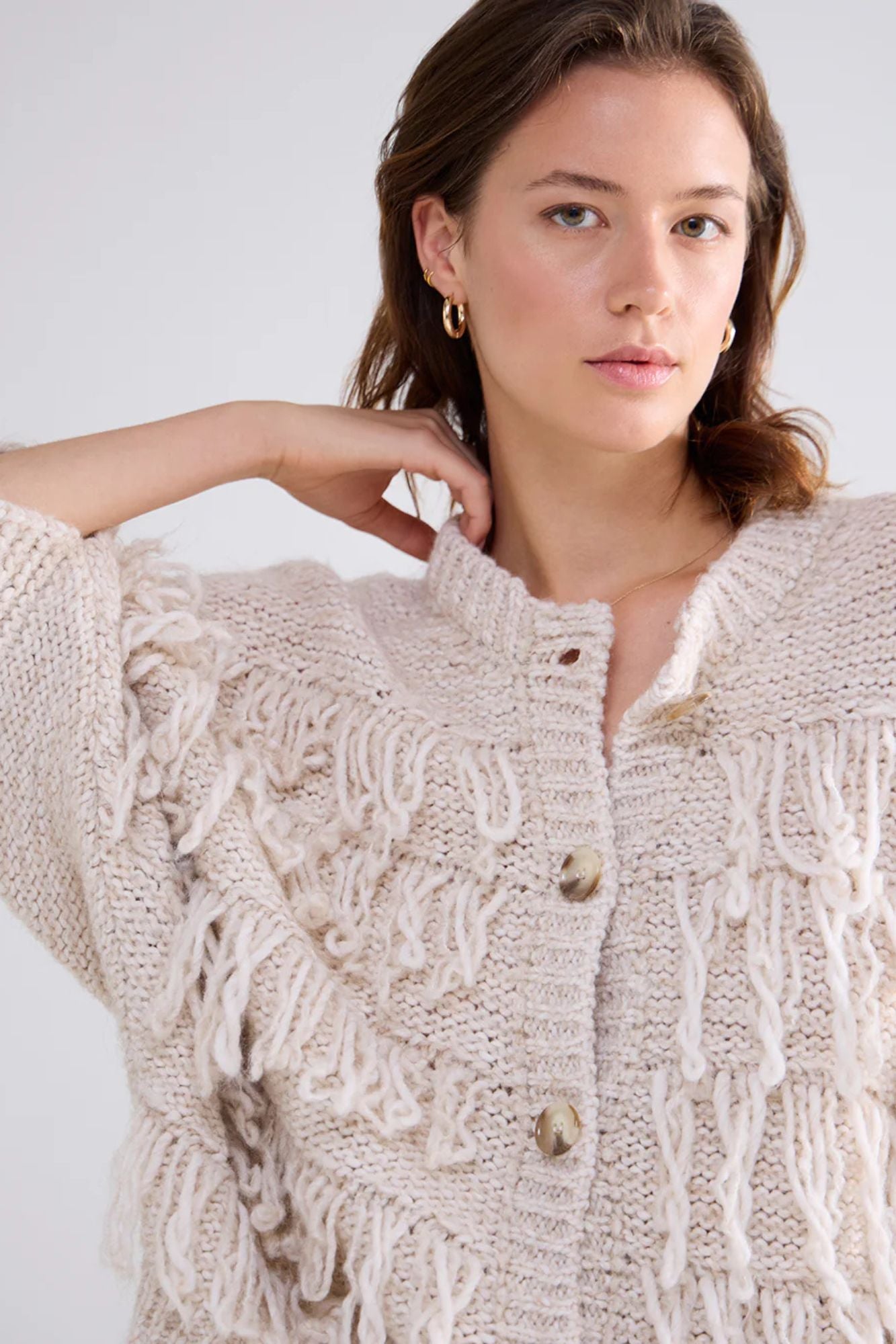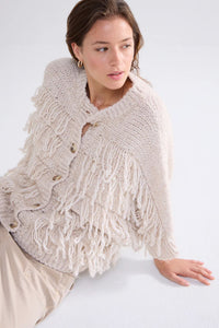 This Kimono-style knitted cardigan adds a touch of bohemian flair with its fringes along the front and sleeves. The button fastening and elbow length sleeves make for an effortless and stylish layering piece.