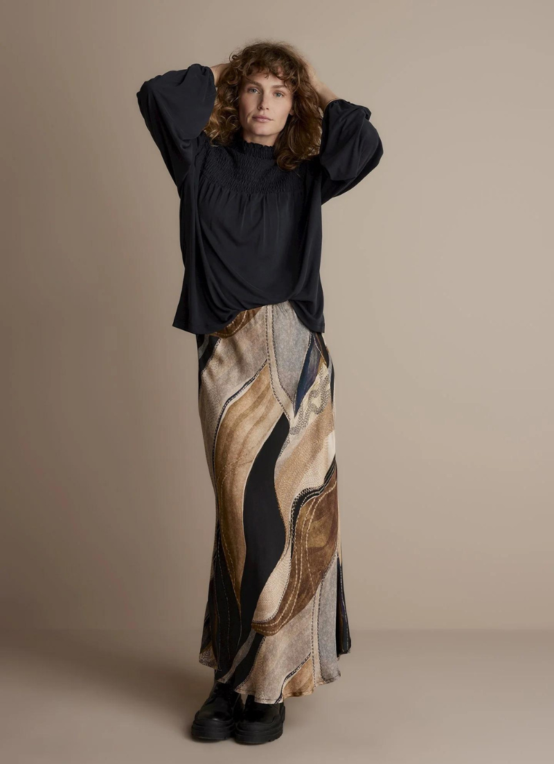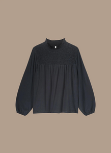 A soft jumper with a smocked neckline and a knitted-on stand-up collar. The loose-fitting jumper is made from a smooth modal-polyester blend and has balloon sleeves.