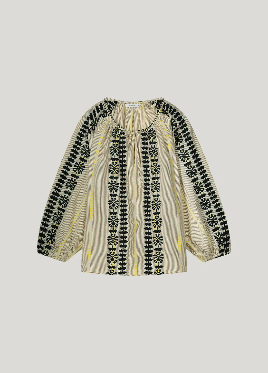 Get ready to elevate your bohemian wardrobe with our Momosa Top! Made of a lightweight blend of cotton and viscose, this airy top features a beautiful stripe pattern and delicate floral embroidery. The round neckline is finished with a unique veston stitch and a drawstring fastening, giving it a touch of charm and versatility. Perfect for any occasion, this top will keep you comfortable and stylish all day long.