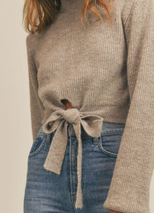 A knit top with a tie-front and mock neck. Featuring a slightly cropped fit and long sleeves. The perfect sweater for the festive period.