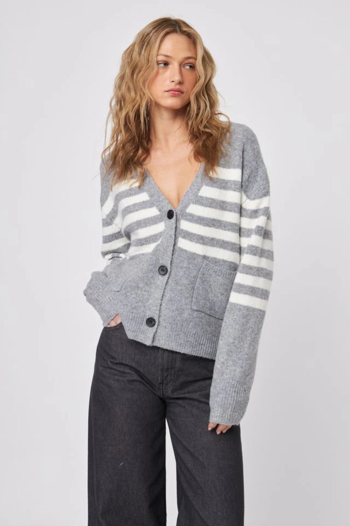 Introducing the Stanley Cardigan—your new favorite layering buddy! This soft grey beauty rocks bold white stripes across the chest and sleeves for a look that's equal parts cozy and cool. The relaxed fit and V-neckline keep things effortlessly chic, while the button-front closure makes getting dressed a breeze. Handy front patch pockets? Check. Ribbed trims for that polished finish? Double check. Whether you're throwing it over a tee or pairing it with a dress, this cardigan is the ultimate go-to for laid-back style that actually works.