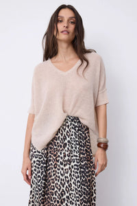Introducing Thesse—your new favorite layering piece that feels like a cloud against your skin. This lightweight cashmere V-neck tee features a relaxed, loose fit that moves with you, complete with practical side slits for effortless style. Ribbed finishes keep everything in place while the sumptuous 100% cashmere fabric delivers unmatched softness and breathability. Dress it up or down—this versatile essential is ready for anything.
