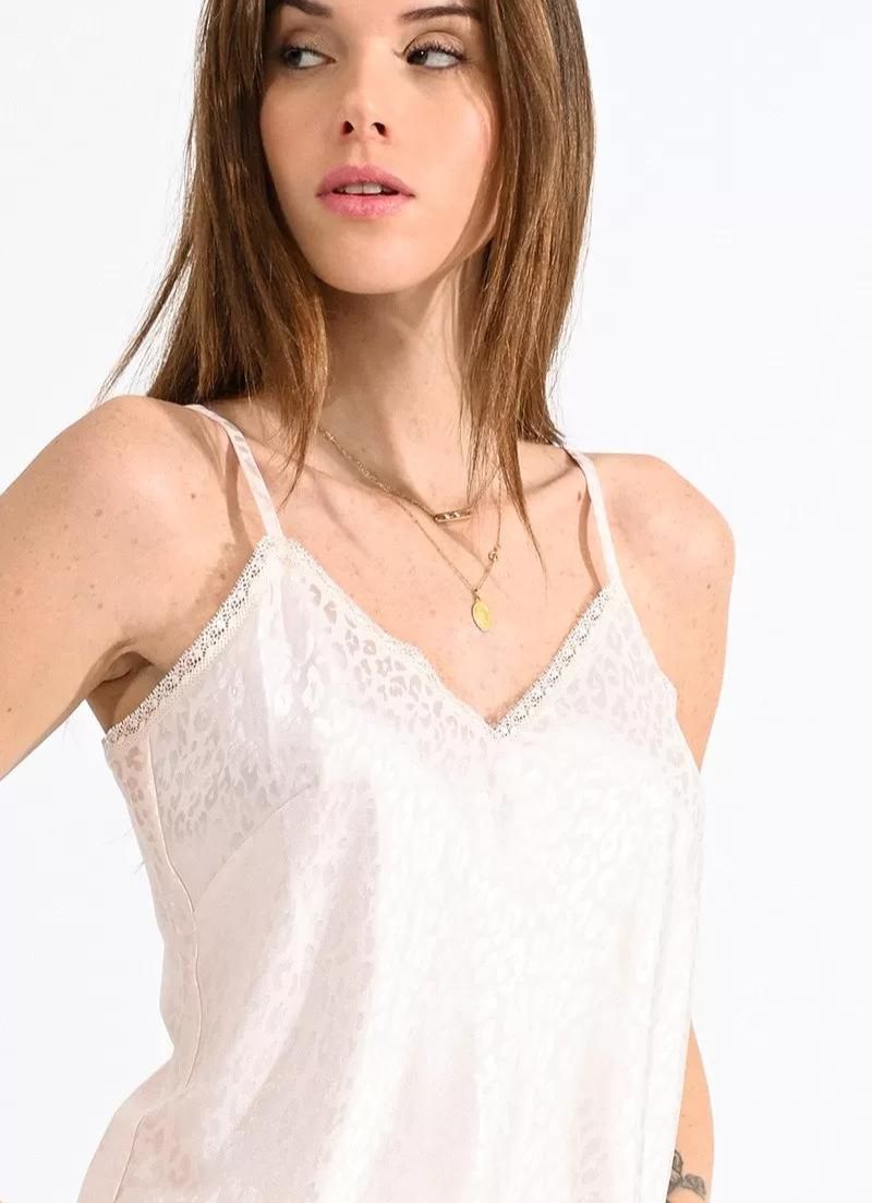 This Willow Camisole in off white is a charming, sassy piece that will add some spice to any wardrobe! Crafted with tone on tone leopard print, delightful V neckline front and back and an airy fluidity, it has all the makings to transform your look. The fine adjustable straps allow you to customize your fit with ease!