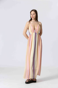 This flowing maxi dress features a deep V-neckline and delicate spaghetti straps, showcasing a fun and colorful print that brightens any day. Crafted from airy rayon fabric, it moves gracefully with every step, making it your go-to for casual outings or special occasions. Embrace effortless style and playful charm wherever you wear it.