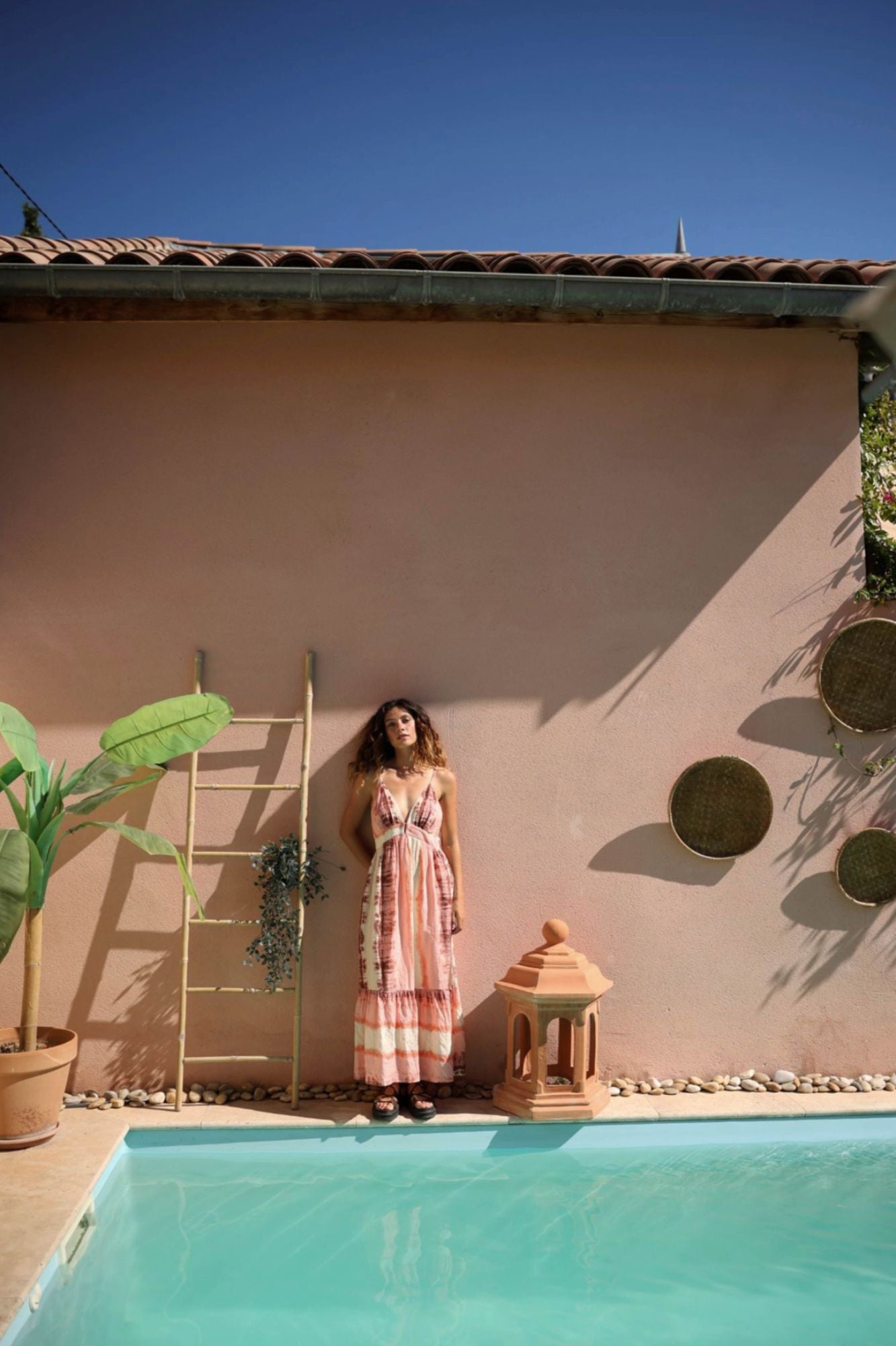 This long tie-dye dress features playful spaghetti straps and a breezy viscose fabric that moves with you. Its vibrant colors and relaxed fit make it perfect for sunny days or casual outings, adding a fun and carefree vibe to your wardrobe.