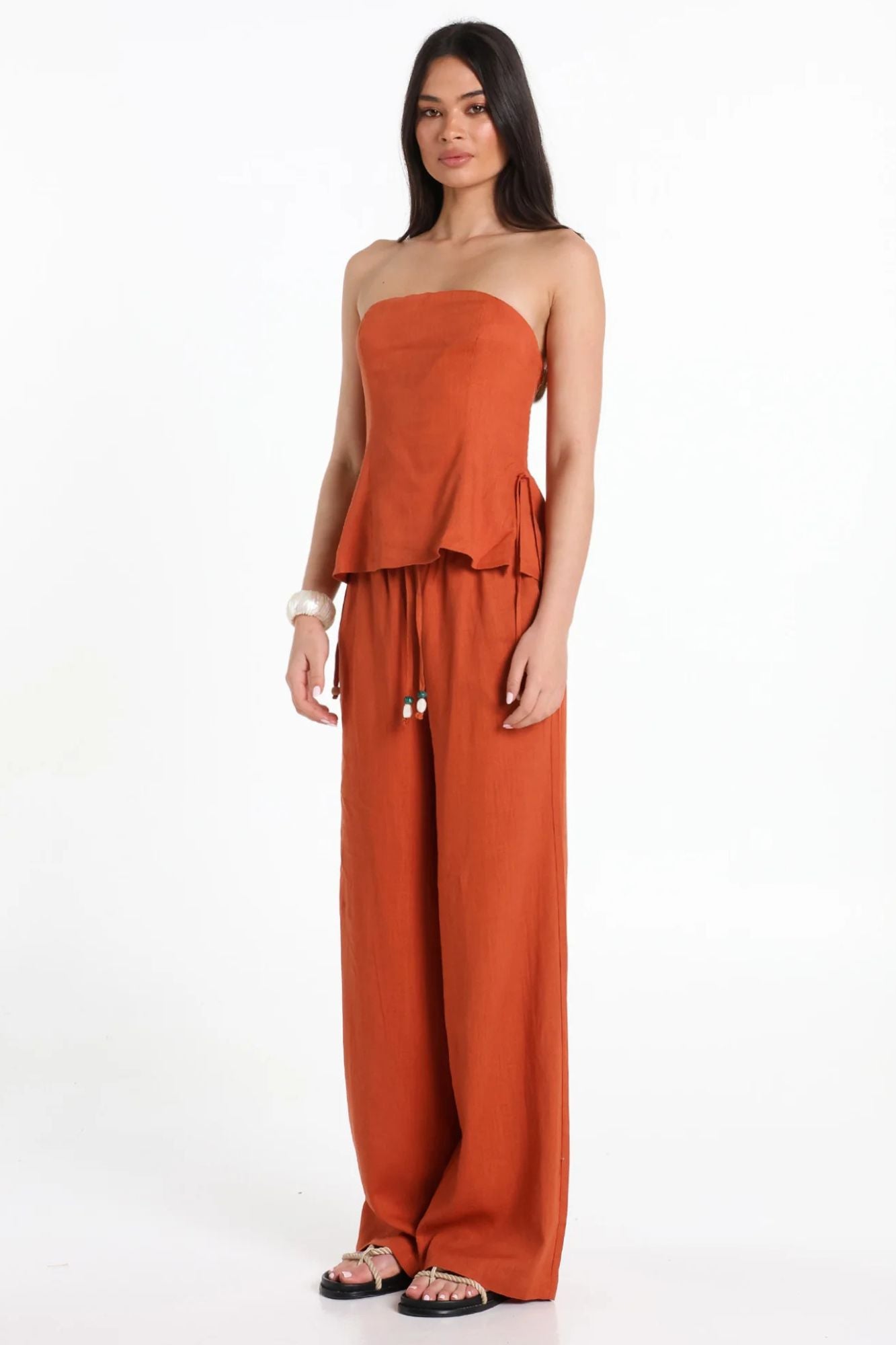 Fall in love with the Arli Top, a terracotta strapless linen blend dream. This top features side seam splits with a beaded tie detail, internal jelly tape for added security, and an elasticated shirred panel at the back for a perfect fit. Fully lined for comfort. Find your new summer staple today!
