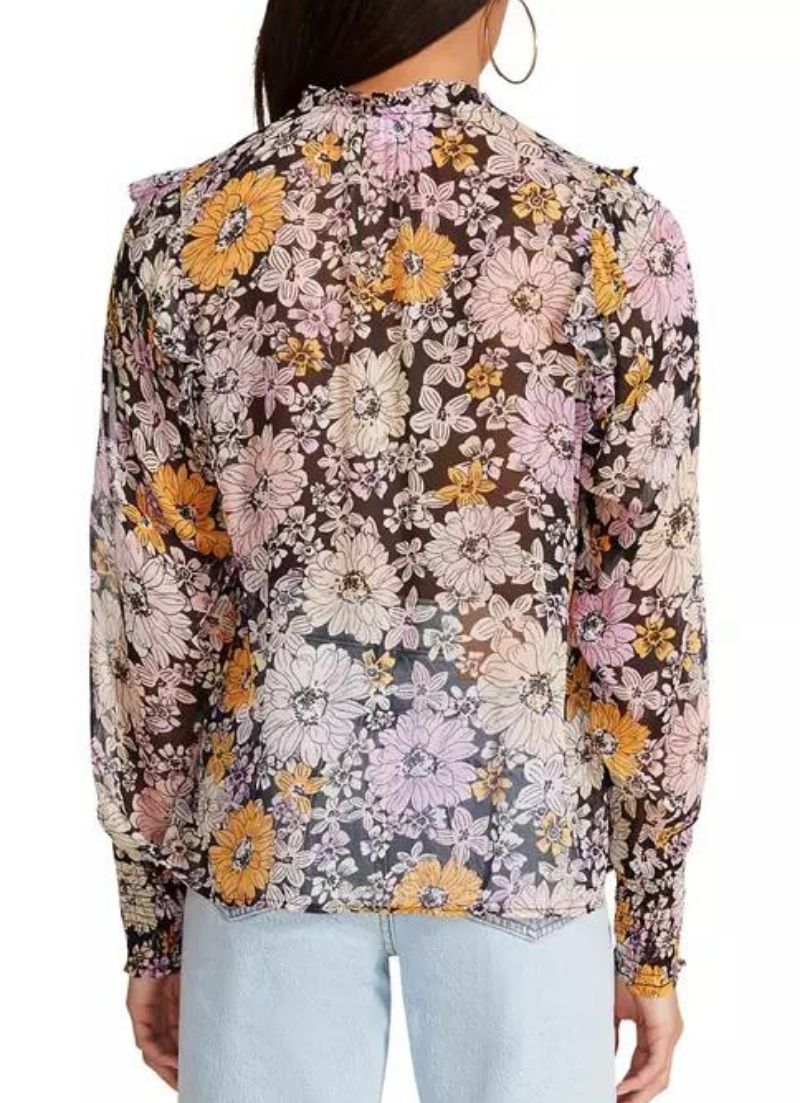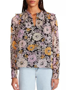 The Floral Me Not Blouse is a lightweight breezy top with long sleeves, a v-neck cut out and slight ruffle texture around the neck, shoulders and back in a gorgeous spring floral print.
