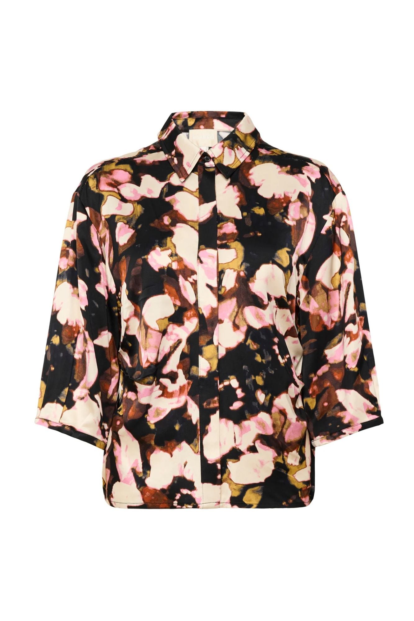 The Cinna Elly Shirt combines lightweight comfort with striking artistry, featuring a floral print in black, pink, and golden tones. Its relaxed fit and hidden button placket offer a sleek, effortless elegance perfect for any occasion. Elevate your wardrobe with this versatile piece that blends subtle sophistication with wearable style.