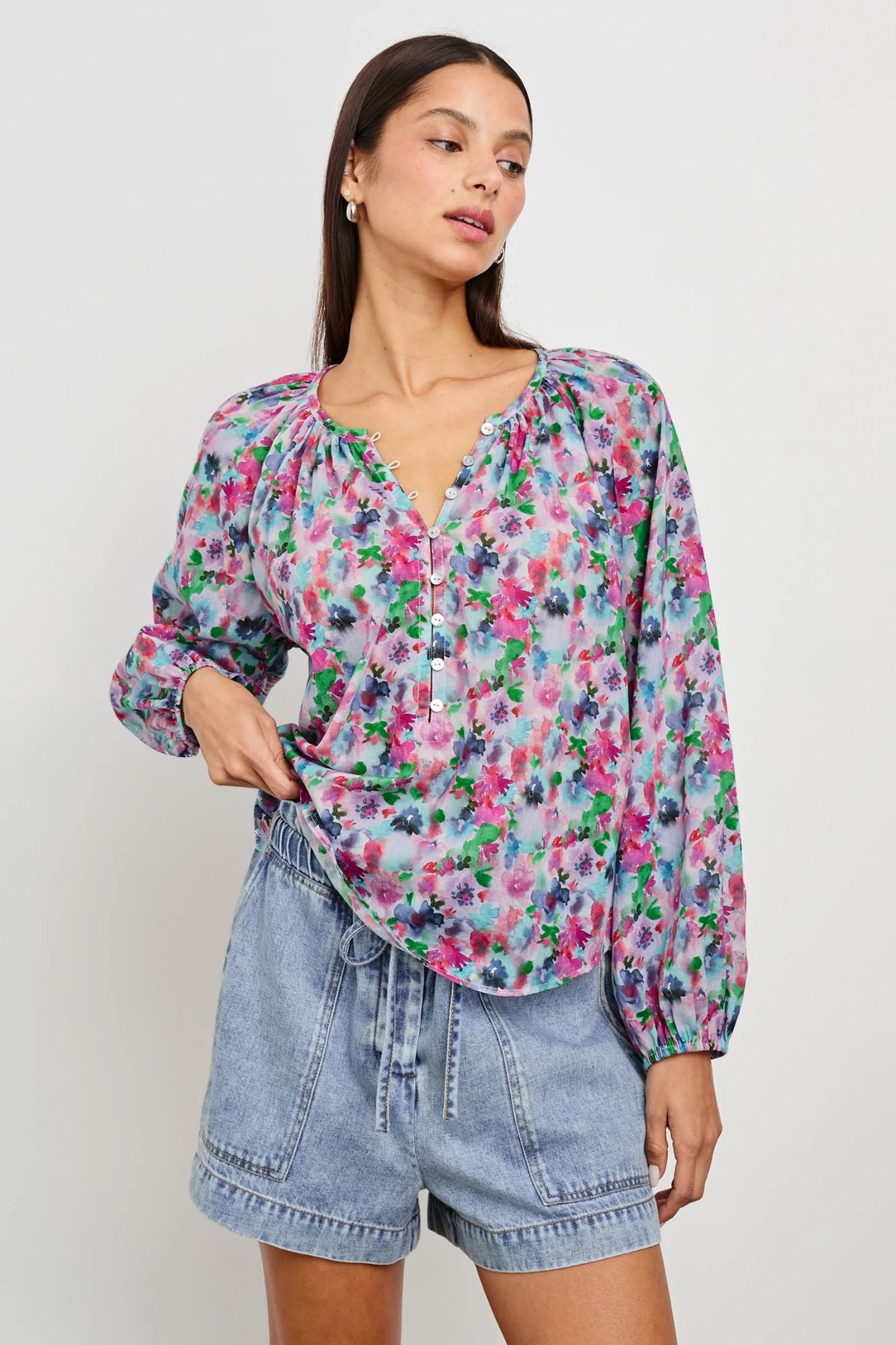 Step back into the swinging 60s with the Indi top! Made from silky 100% viscose, it features sheer, billowy sleeves and charming natural shell buttons. The playful babydoll shape and elasticated cuffs add a flirty, carefree vibe perfect for any season. Effortlessly chic and fun to wear, this blouse brings vintage flair to your modern wardrobe.
