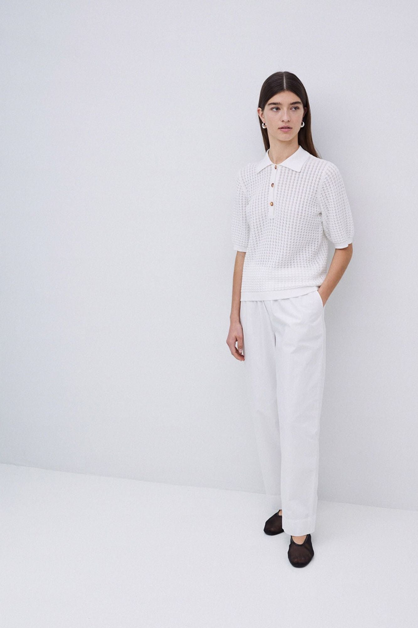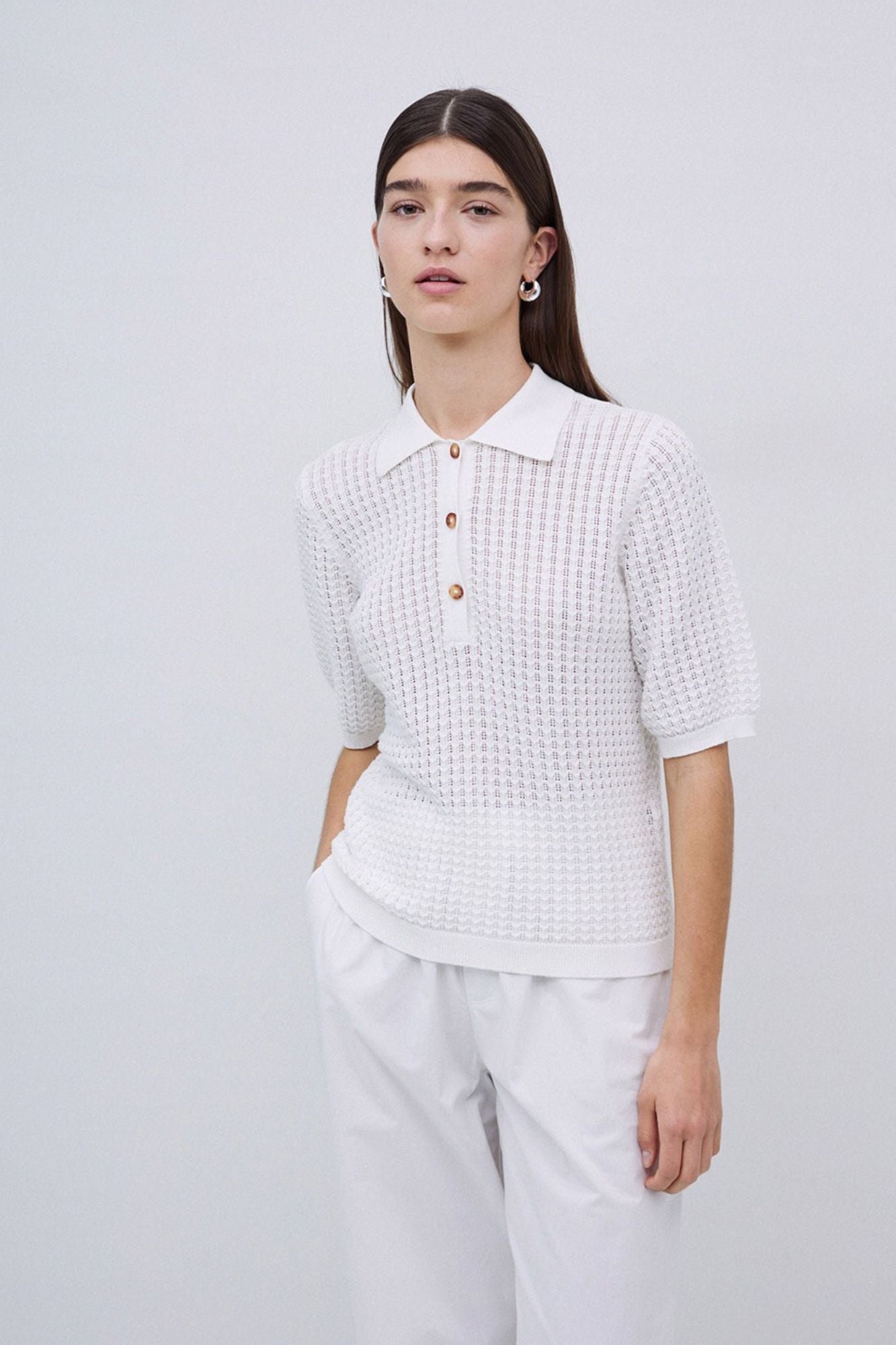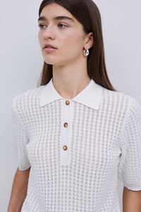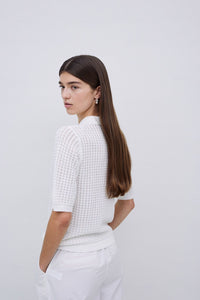 This openwork knit jumper combines breathable 100% organic cotton with stylish details for effortless comfort. Featuring a classic polo neckline accented by tortoiseshell-style buttons and ribbed trims, it offers a refined look perfect for layering or wearing alone. Short sleeves keep it light and versatile, making it an ideal choice for any season. Elevate your wardrobe with this eco-friendly, chic essential.
