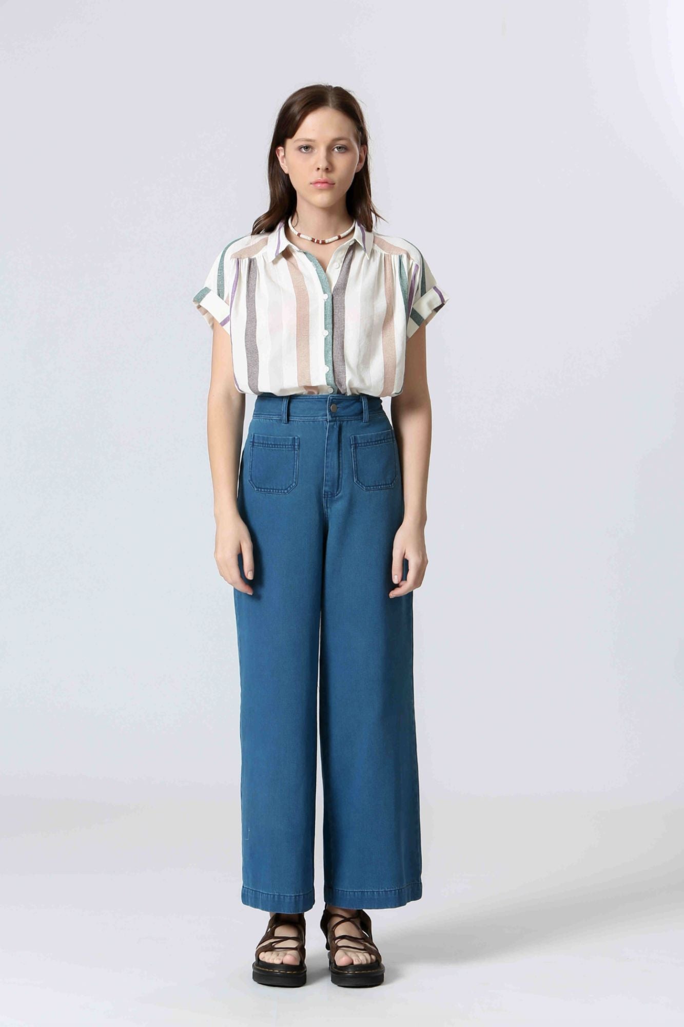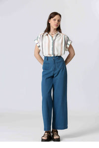 This playful striped button-up blouse is crafted from 100% cotton for breathable comfort. Featuring cute, colorful stripes and a relaxed boxy fit, it adds a fun pop of pattern to any outfit while keeping you cool and stylish all day long.