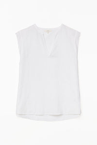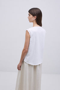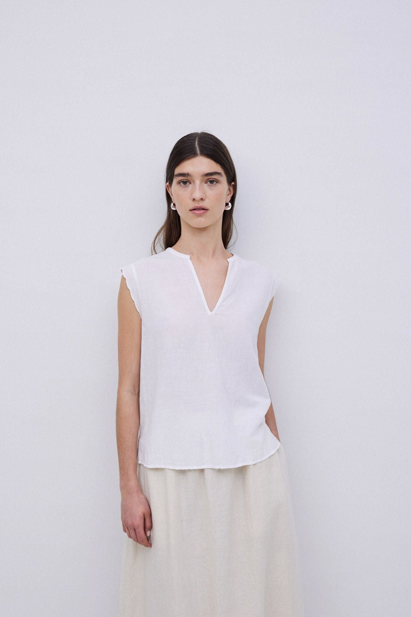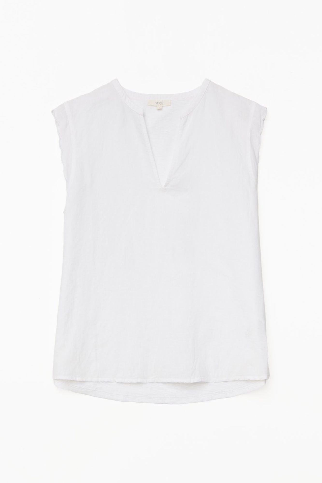 This sleeveless blouse combines a cotton-linen blend front with a soft slub cotton back for breathable comfort and subtle texture contrast. Its straight cut and Mao neck offer a modern, flattering silhouette, while wave trim details and hem slits add elegant movement. Finished with an embroidered YERSE logo, this blouse effortlessly blends style and comfort for your wardrobe.