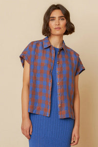 Effortlessly stylish, the Indi & Cold Checked Linen Blouse is a must-have for any wardrobe. Made from a blend of linen and cotton, this boxy short sleeve blouse features a classic checked pattern, a button front, and a collar. With its versatile design, it can be worn as a lightweight jacket or a chic blouse. Don't miss out on this super cute and practical piece!