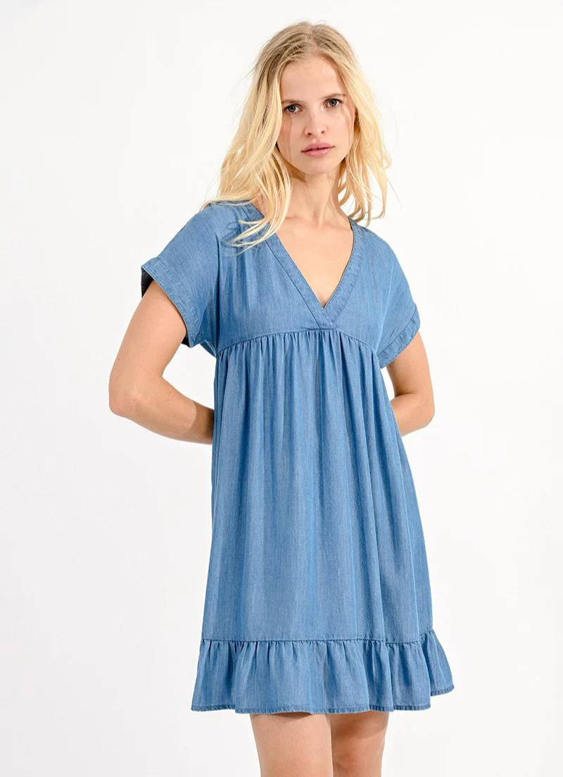 Get ready to turn heads in the Zara Woven Dress. Made of lightweight Lyocell, this flared mini-dress features a flattering V-neckline, wide armholes, and a small ruffled trim. Perfect for any occasion, this dress is simply essential for your wardrobe.