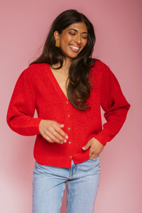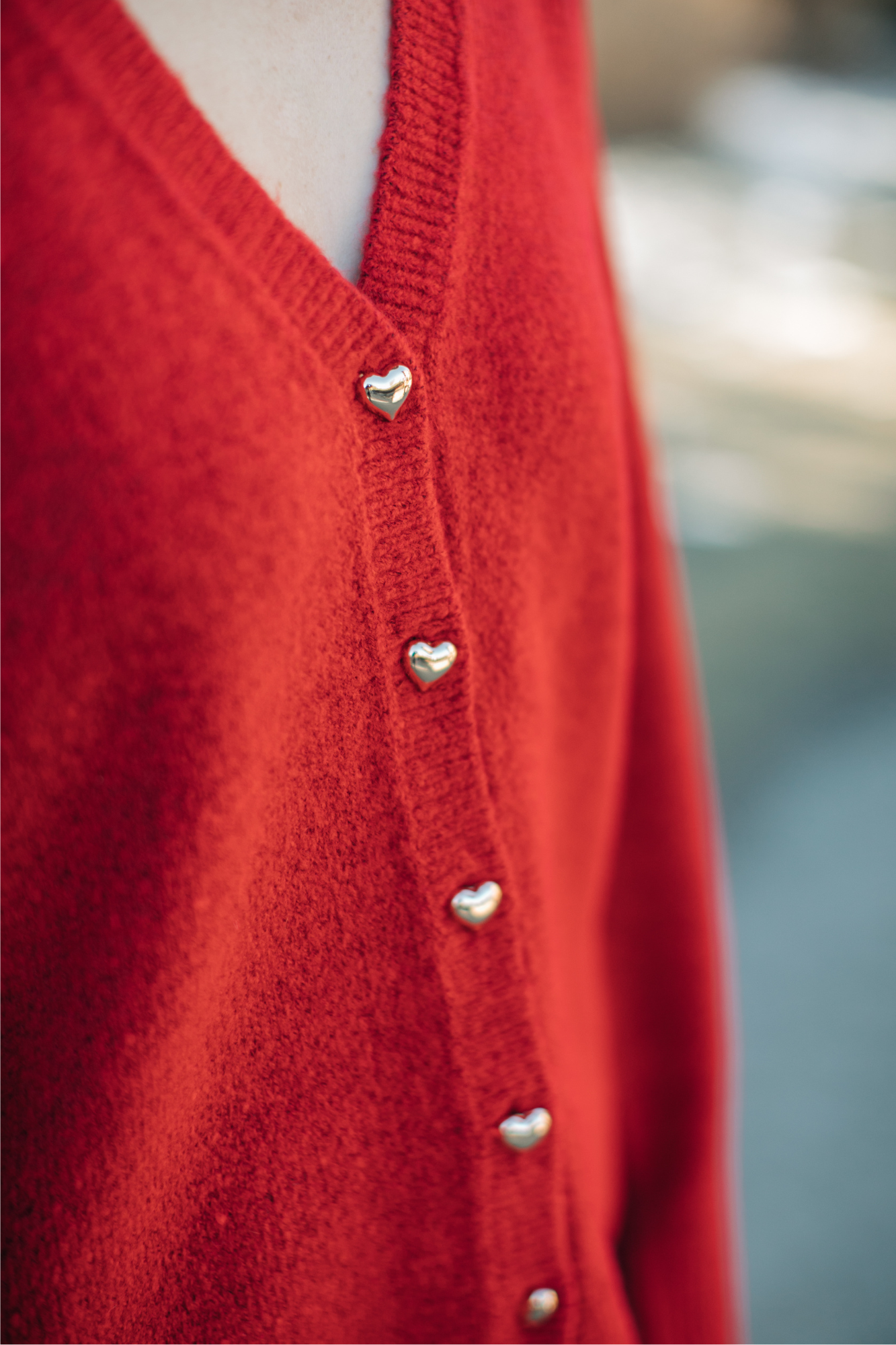 Made from the softest, coziest knit blend, this cardigan will keep you warm and snug all day long. It features a boxy, relaxed fit with gathered voluminous shoulders and ribbed cuffs for a flattering shape. Each colour is accented with either silver or gold heart-shaped buttons, adding the perfect fun detail to this already adorable piece.