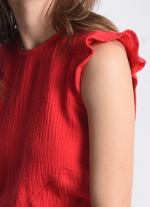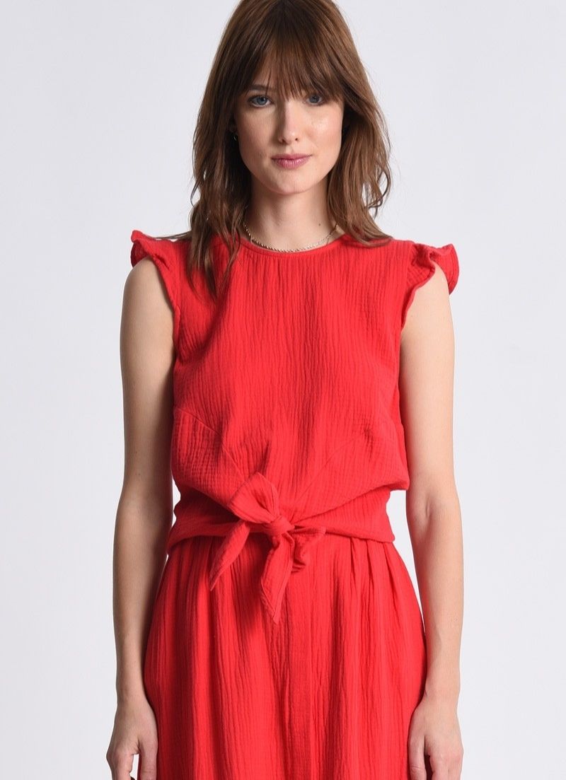 Sleeveless blouse featuring a straight silhouette, ruffled sleeves and a fabric tie up.