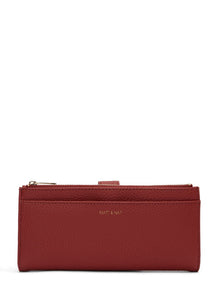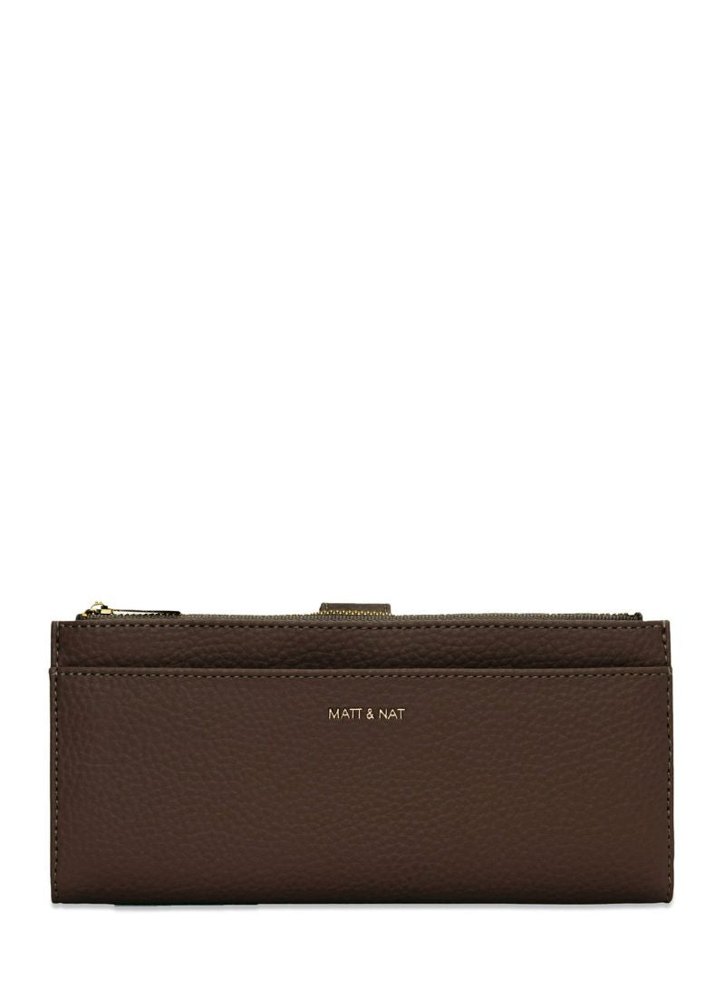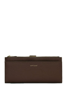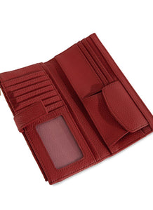 A wallet featuring a snap closure, zipper coin pocket, and a front pocket with snap closure. The interior includes 11 card slots, 1 bill compartment and 4 slip pockets.