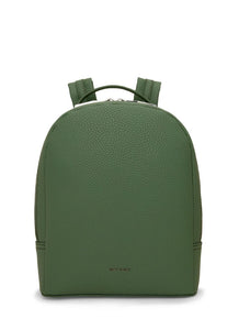 A small backpack with adjustable straps, a main metal zipper opening and an exterior back zipper pocket. There is a cell phone slip pocket and a compartment on the inside.