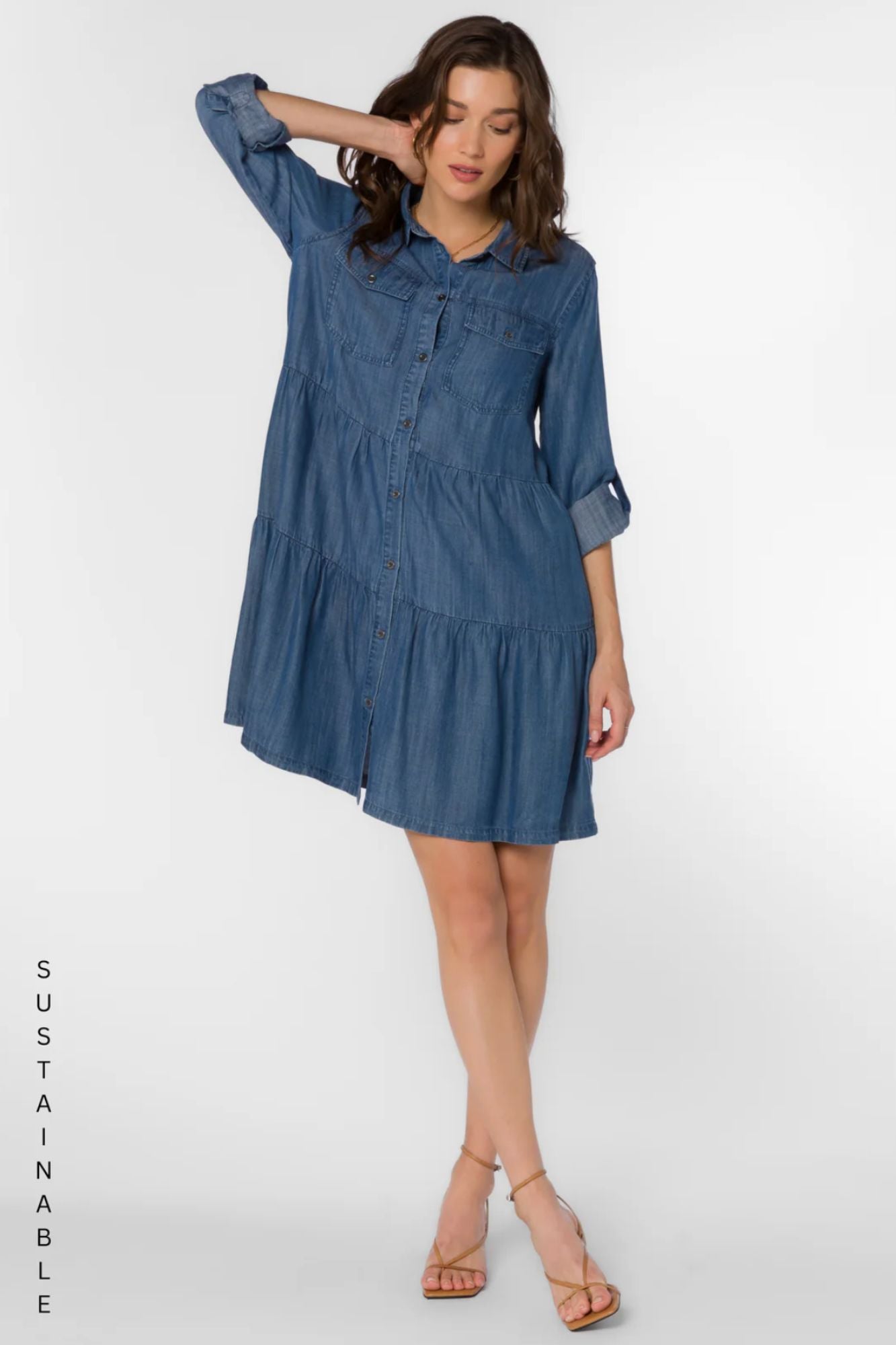 Our beloved tiered babydoll dress gets a fresh update in breezy denim-blue chambray Tencel. Crafted from eco-conscious lyocell, this wardrobe essential features a crisp collar, front button closure, clever roll-tab sleeves for easy styling, and practical front pockets. The flattering knee-length silhouette with back yoke detail makes it perfect for everything from casual weekends to dressed-up days. Machine washable and imported for quality you can feel.