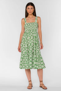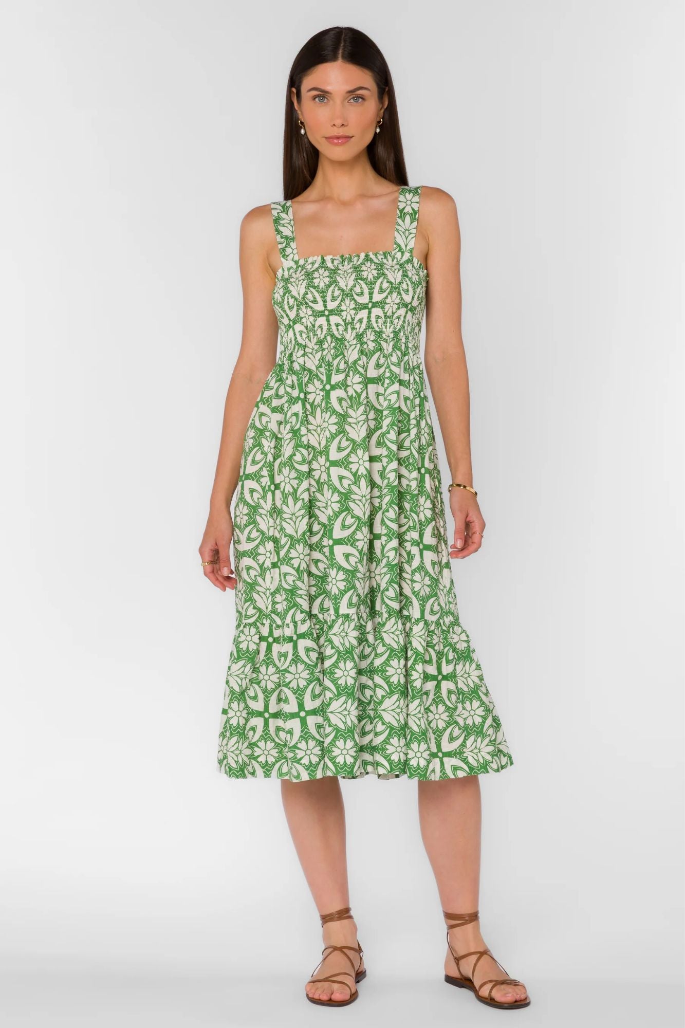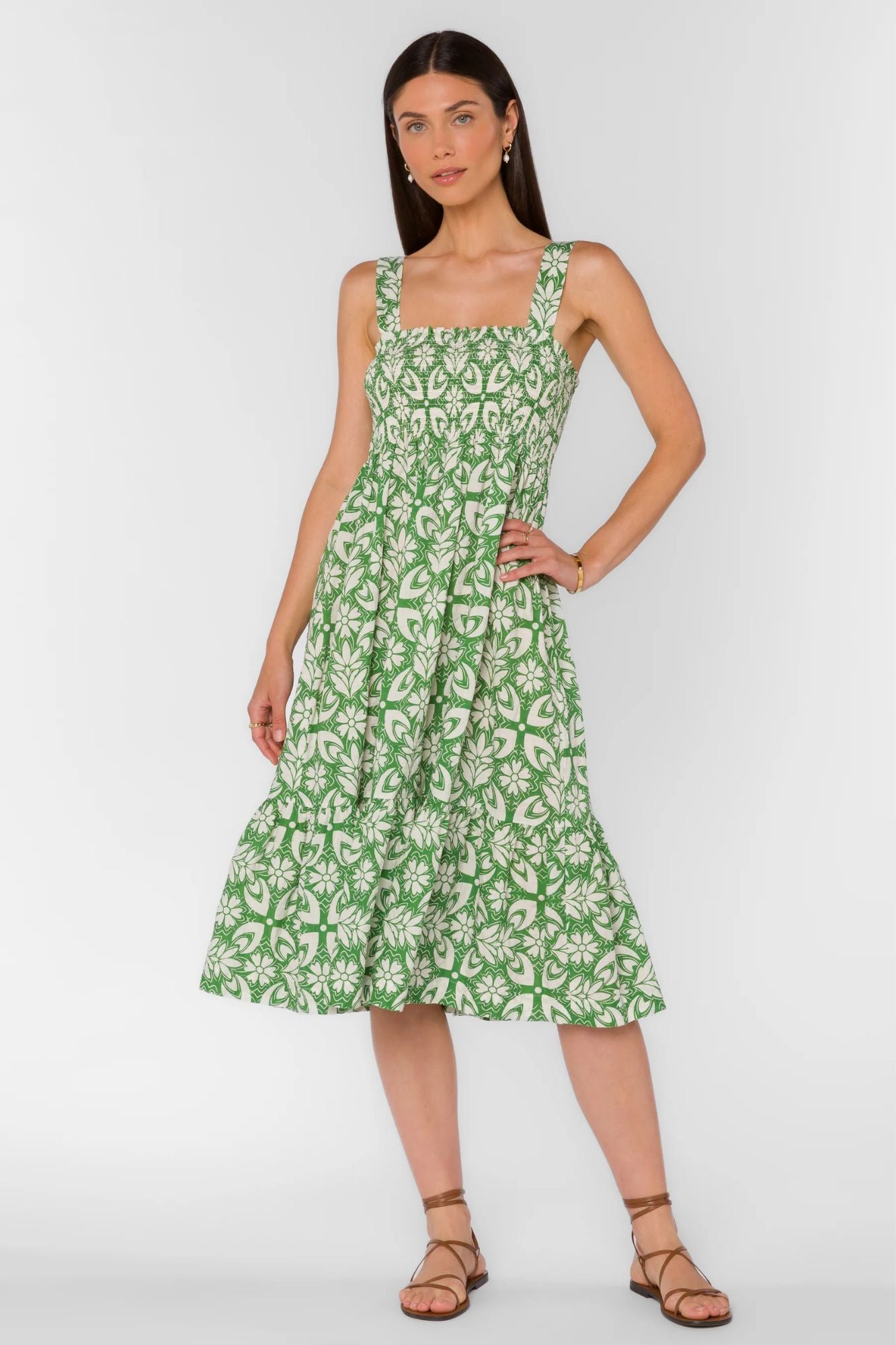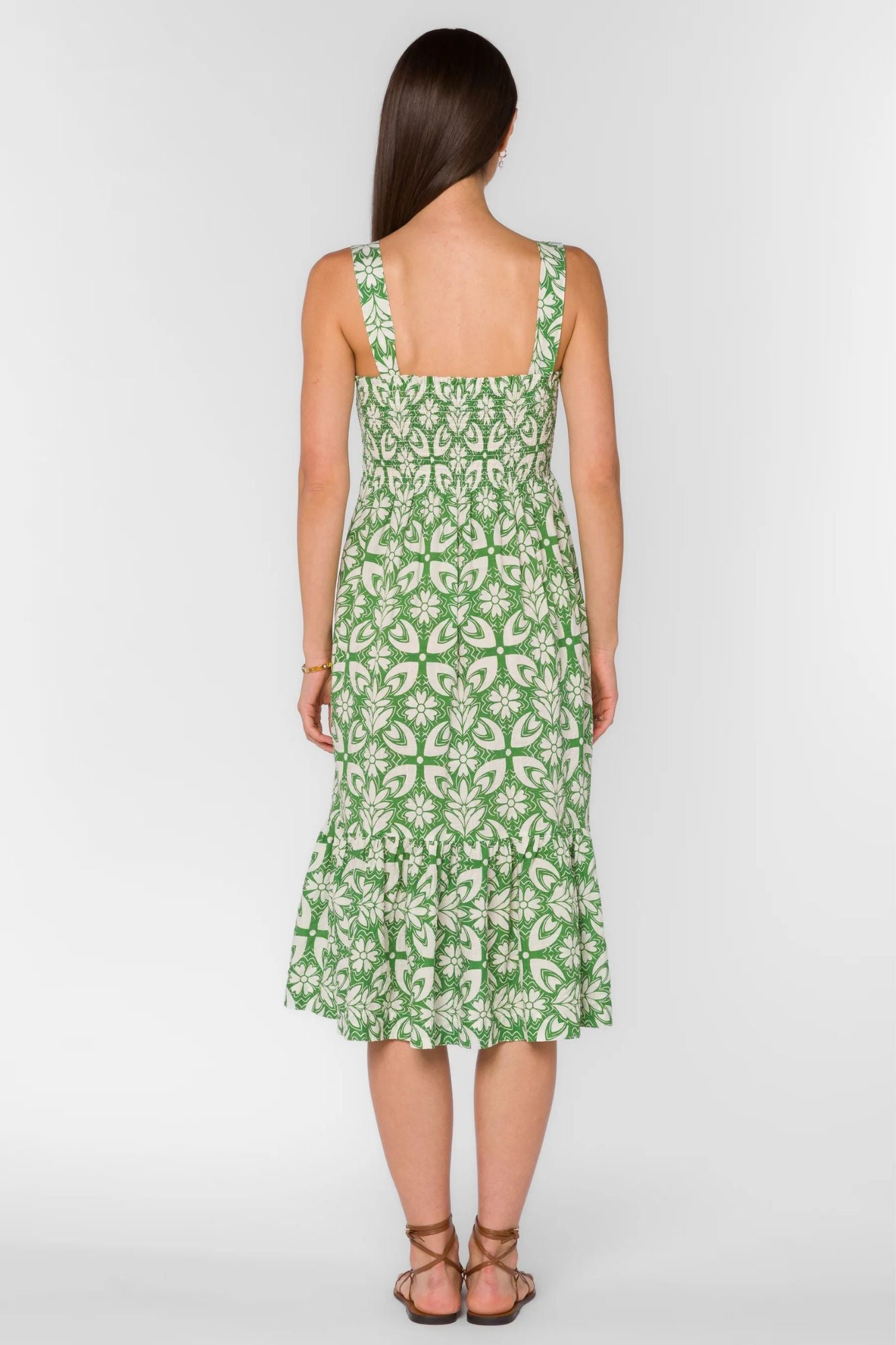Elevate your style with the Kehlani Dress. Featuring an eye-catching geo pattern, adjustable straps and a smocked empire waist for a flattering fit. Whether it's a special occasion or a night out, this midi dress will make you feel confident and stylish. Don't miss out on this must-have piece!