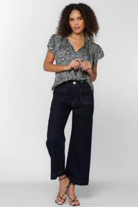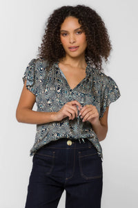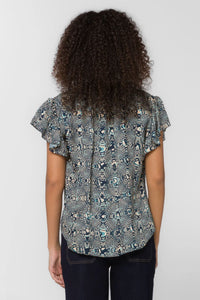 Effortlessly chic, this navy abstract popover slips right on with a playful tie-neck detail that adds instant personality. The flutter sleeves and curved back hem create a flattering, flowy silhouette that moves with you. Crafted from a sumptuous viscose-rayon blend, it's soft, breathable, and perfect for layering or wearing solo. Slip it on, tie it up, and you're ready to go—no fuss, just fun.