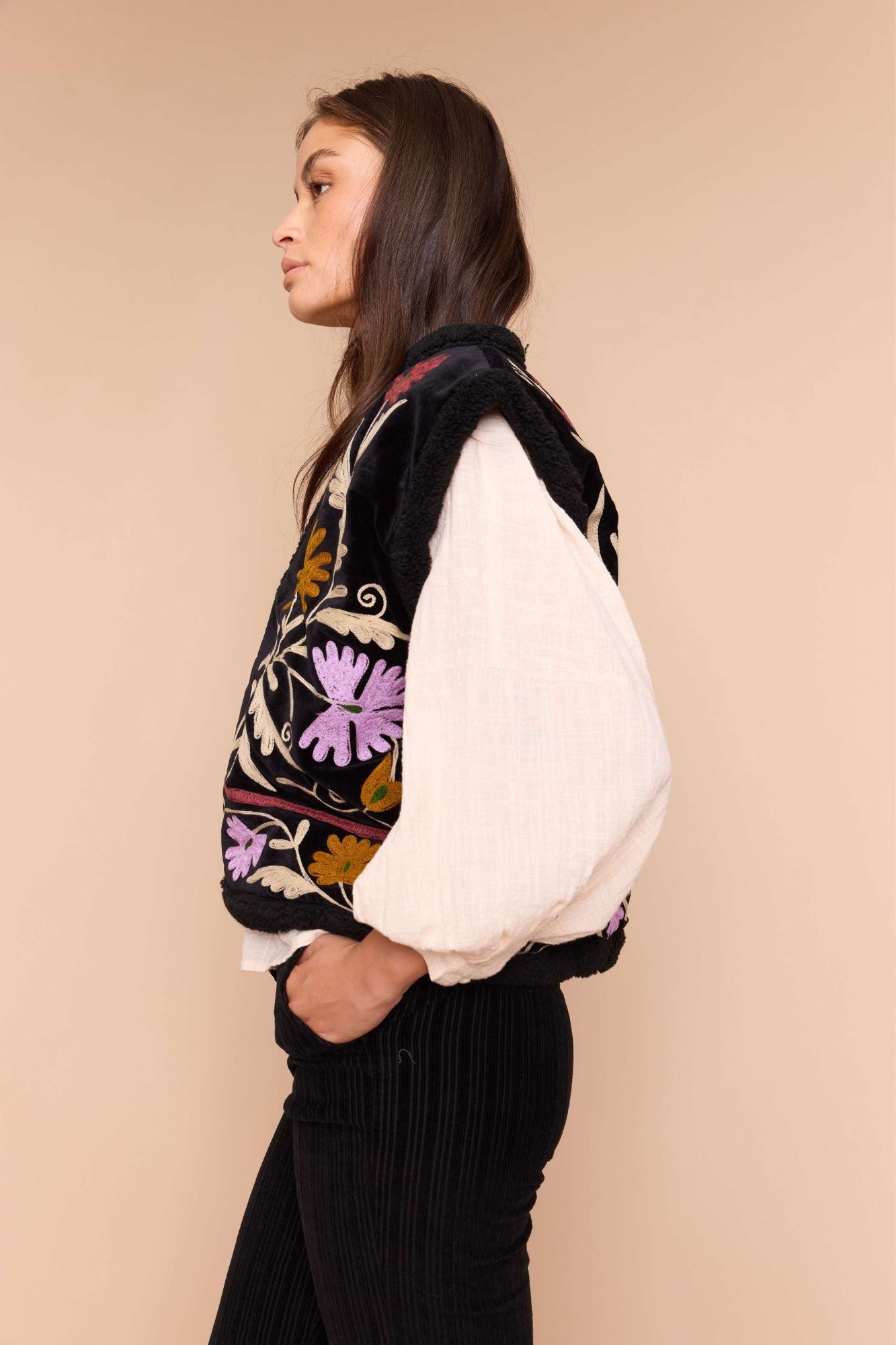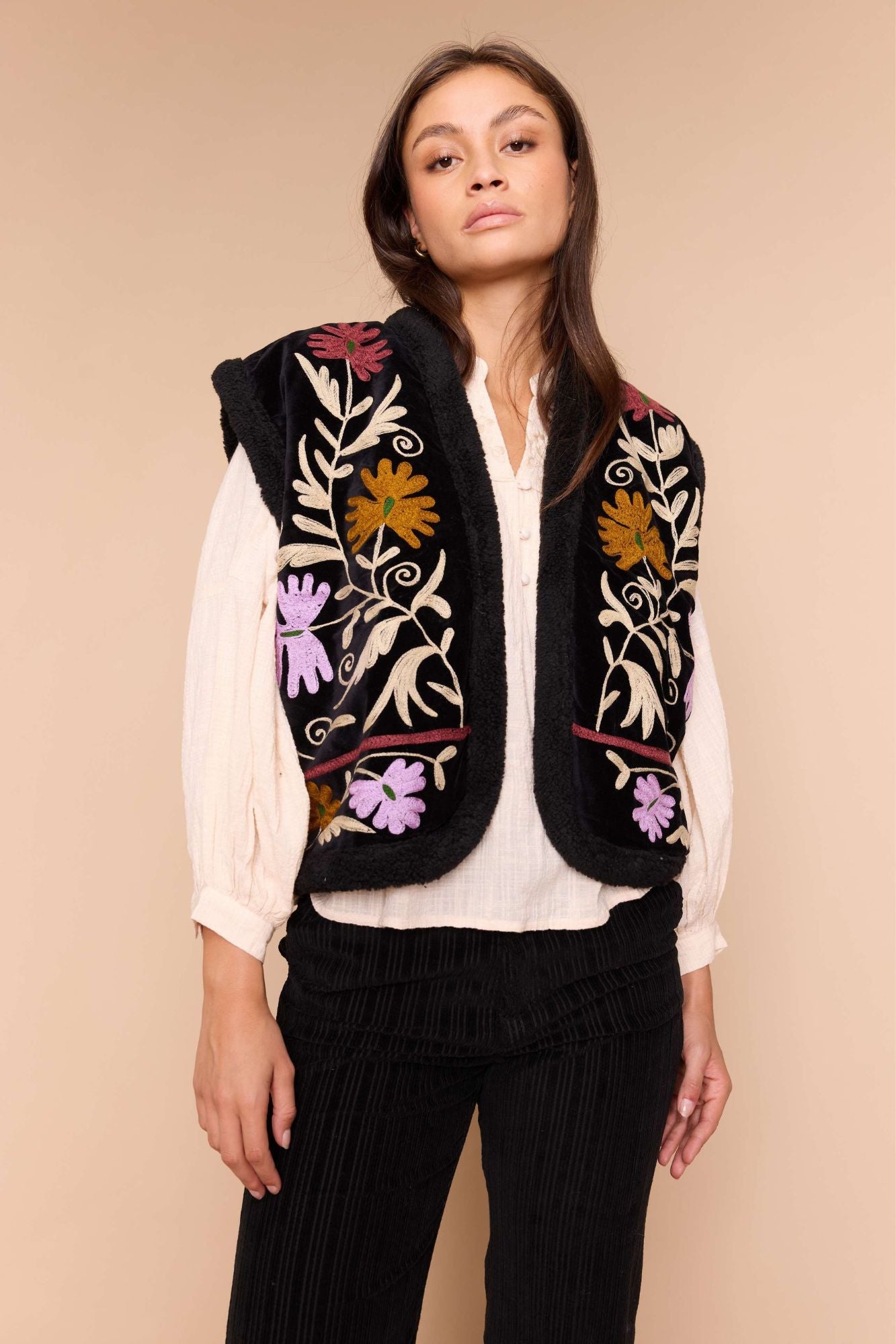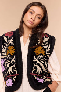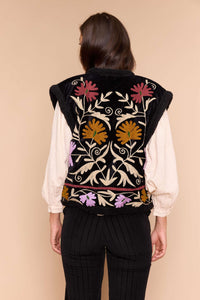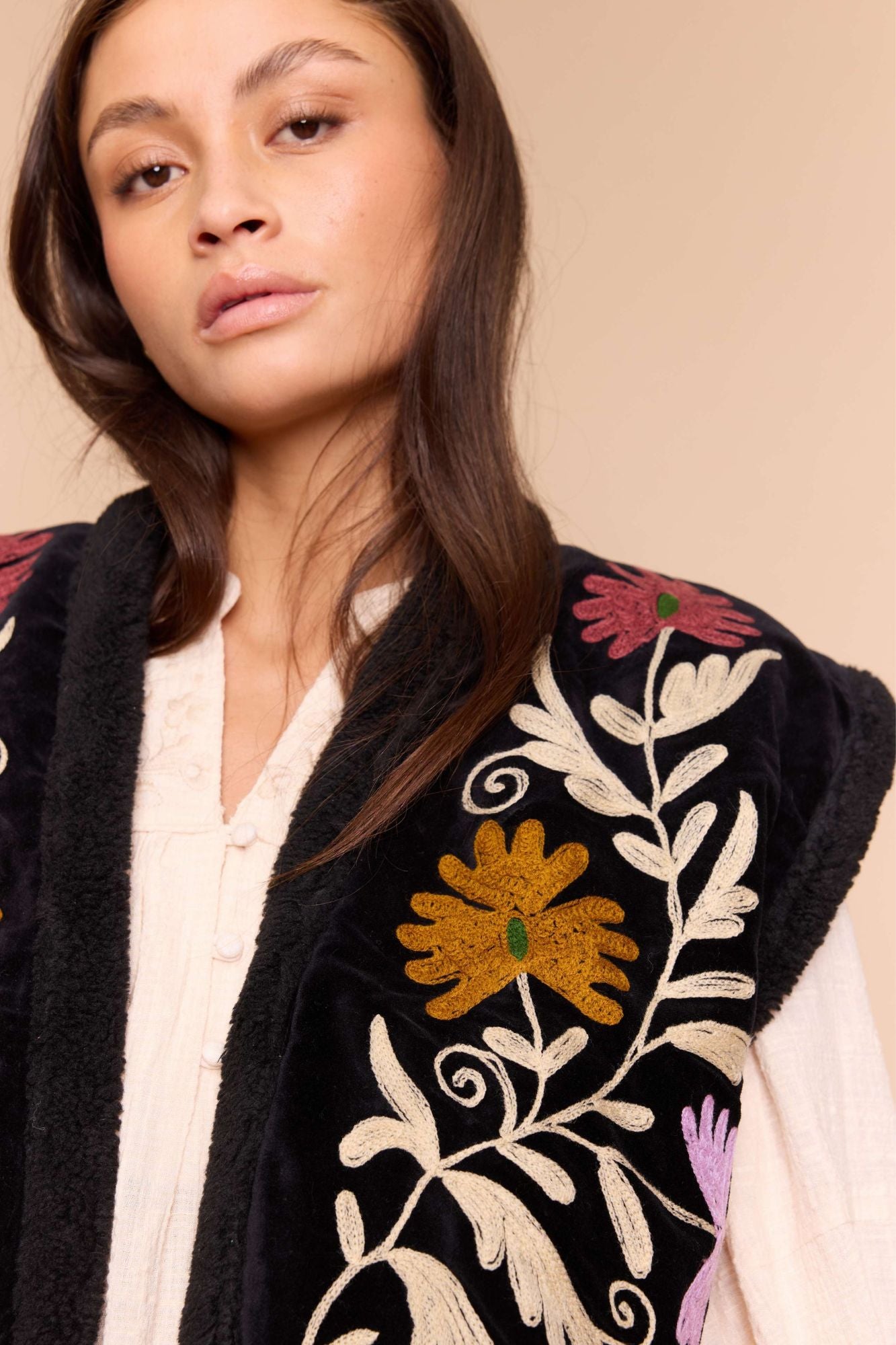 Dare to stand out with our Darren Vest - a cozy, sleeveless fur vest featuring unique suzani all-over embroidery. This thick and warm vest is perfect for adding a pop of personality to your outfit. (Trust us, you won't want to take it off!)