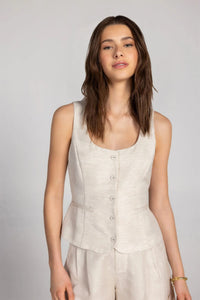 The Milano Vest offers a modern twist on classic tailoring with its softly structured design and tailored fit. Featuring a deep scoop neckline and a fitted silhouette crafted from lightweight suiting fabric, this vest effortlessly elevates any outfit. Wear it alone for a sleek look or layer it under a blazer for added sophistication. The front button closure adds a polished finish, making the Milano Vest a versatile wardrobe essential.
