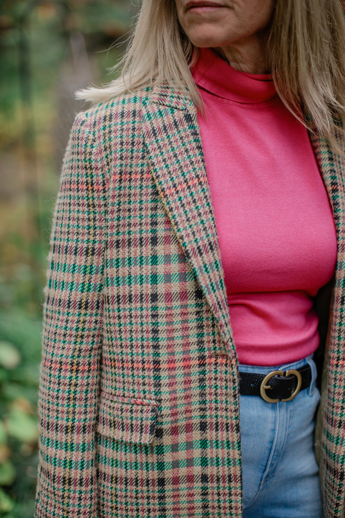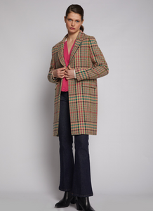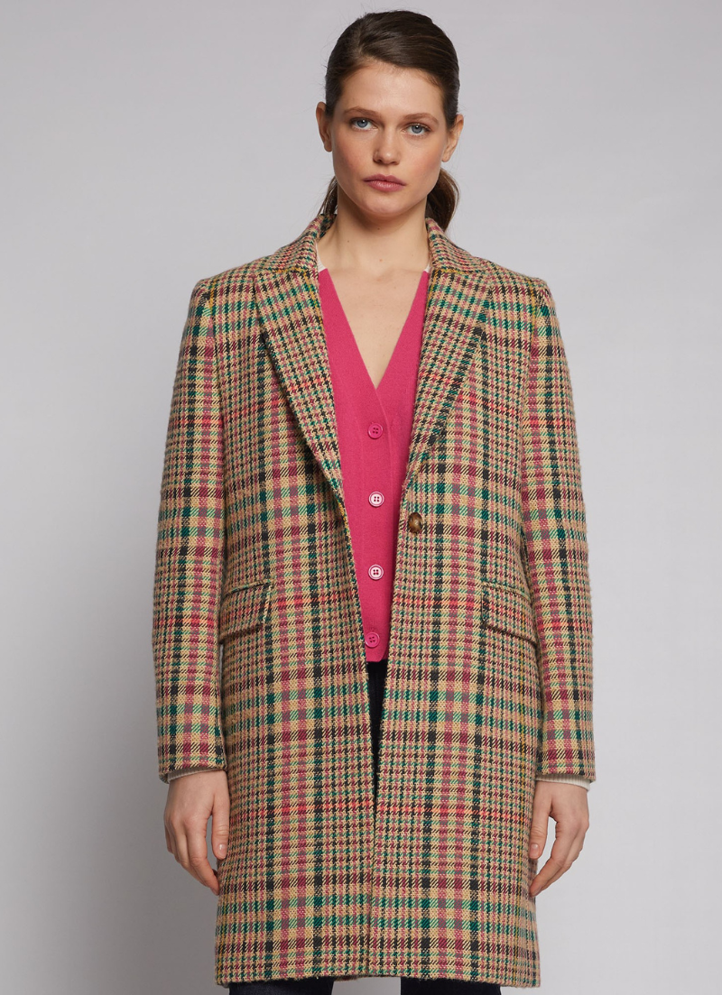 Tan checkered coat with multicolored profiles made with Italian fabric. Closing with a button. Side pockets. Back opening. Beige lining. Made in Spain. The model is 1'74 cm tall and wearing a 38.