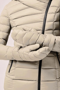 Stay warm and stylish with the JULIA Quilted Down Puffer Mitts from SOIA & KYO. Made with certified 100% recycled nylon and a cozy fleece lining, these mittens are perfect for any cold weather adventure. Keep them together with exterior clips and enjoy the chic chevron quilting and wrist cinch.