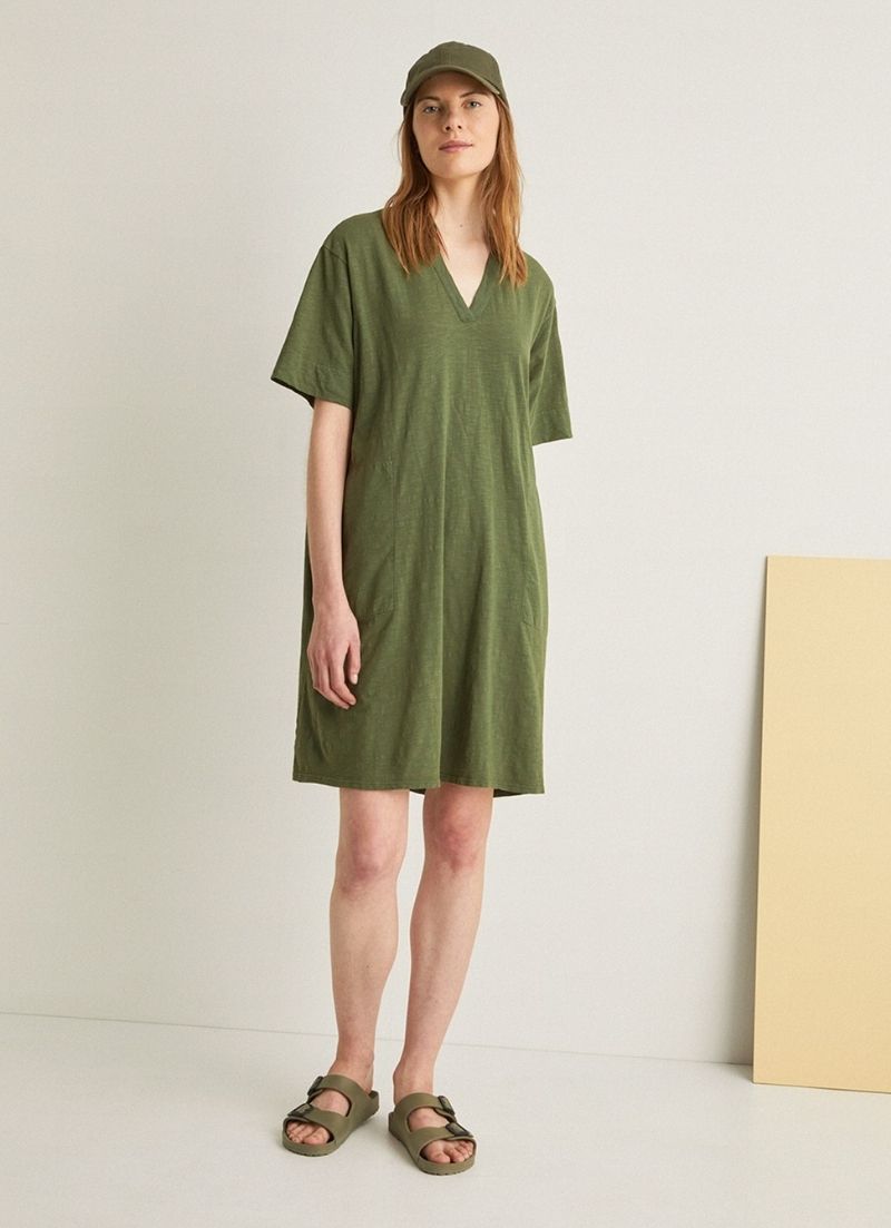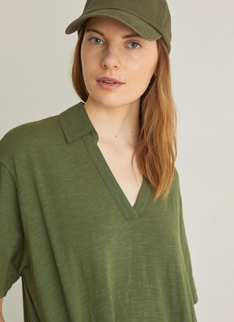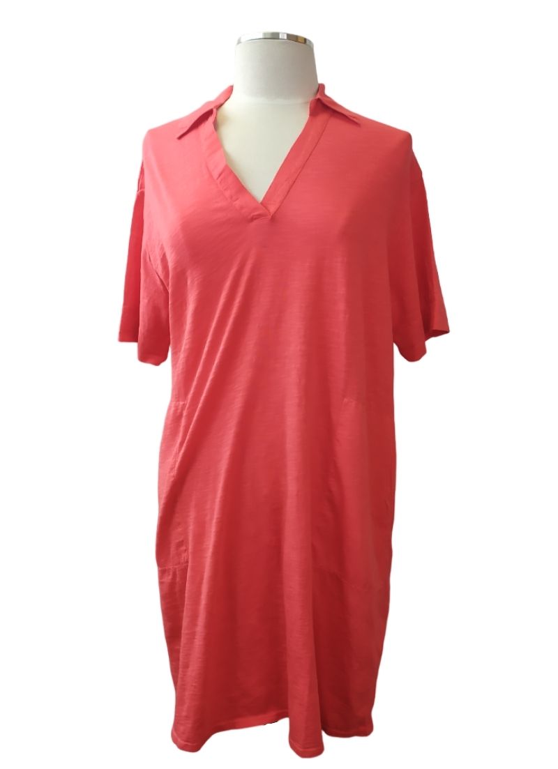 The Cora is a short-sleeve midi dress with polo neckline and a straight cut.