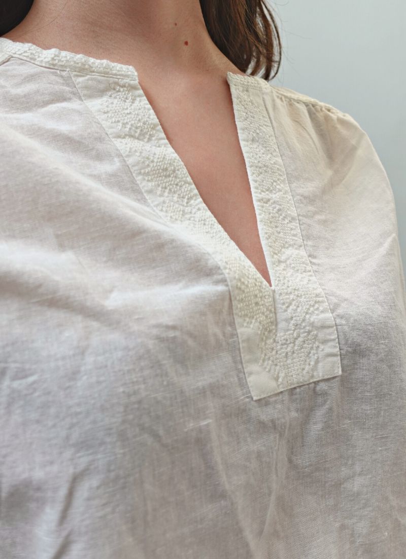 The Thea is an embroidered sleeveless blouse. It features a v-neckline.