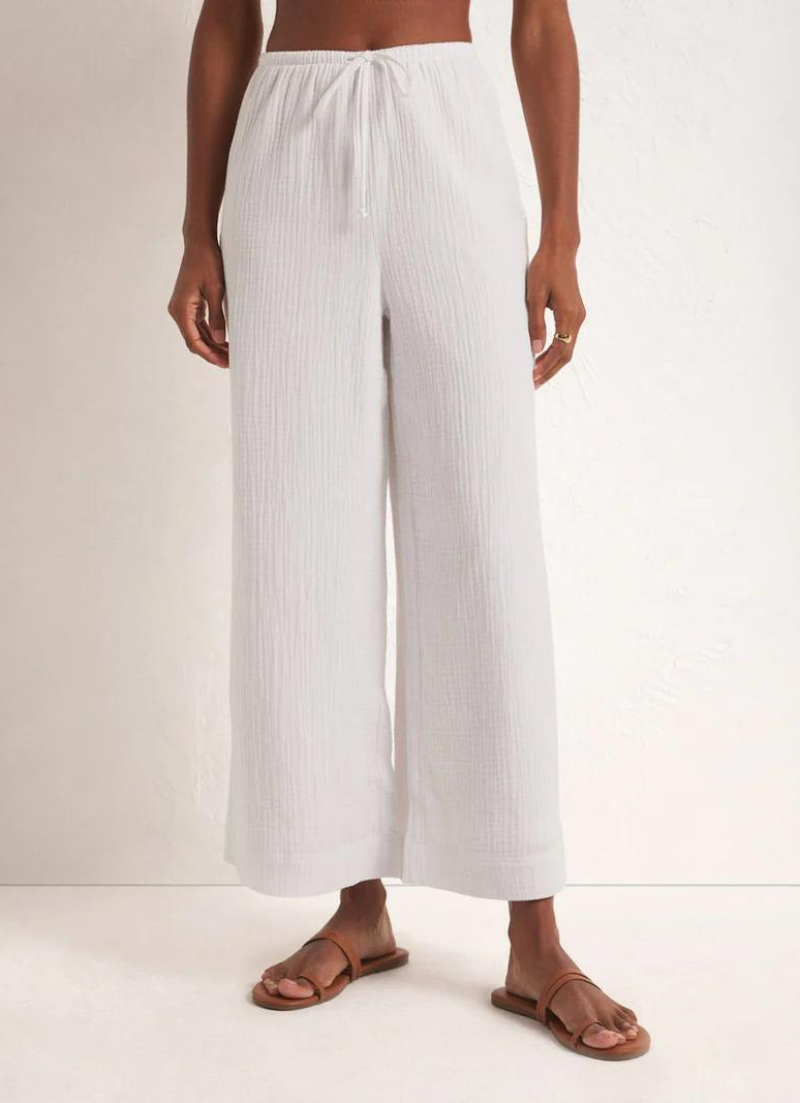 The easiest pant you'll ever wear. This relaxed, wide leg pant features a shorter length than our Bondi Gauze Pant and a more narrow pull-on elastic waistband for all day comfort. Model is 5′9″ wearing size S.