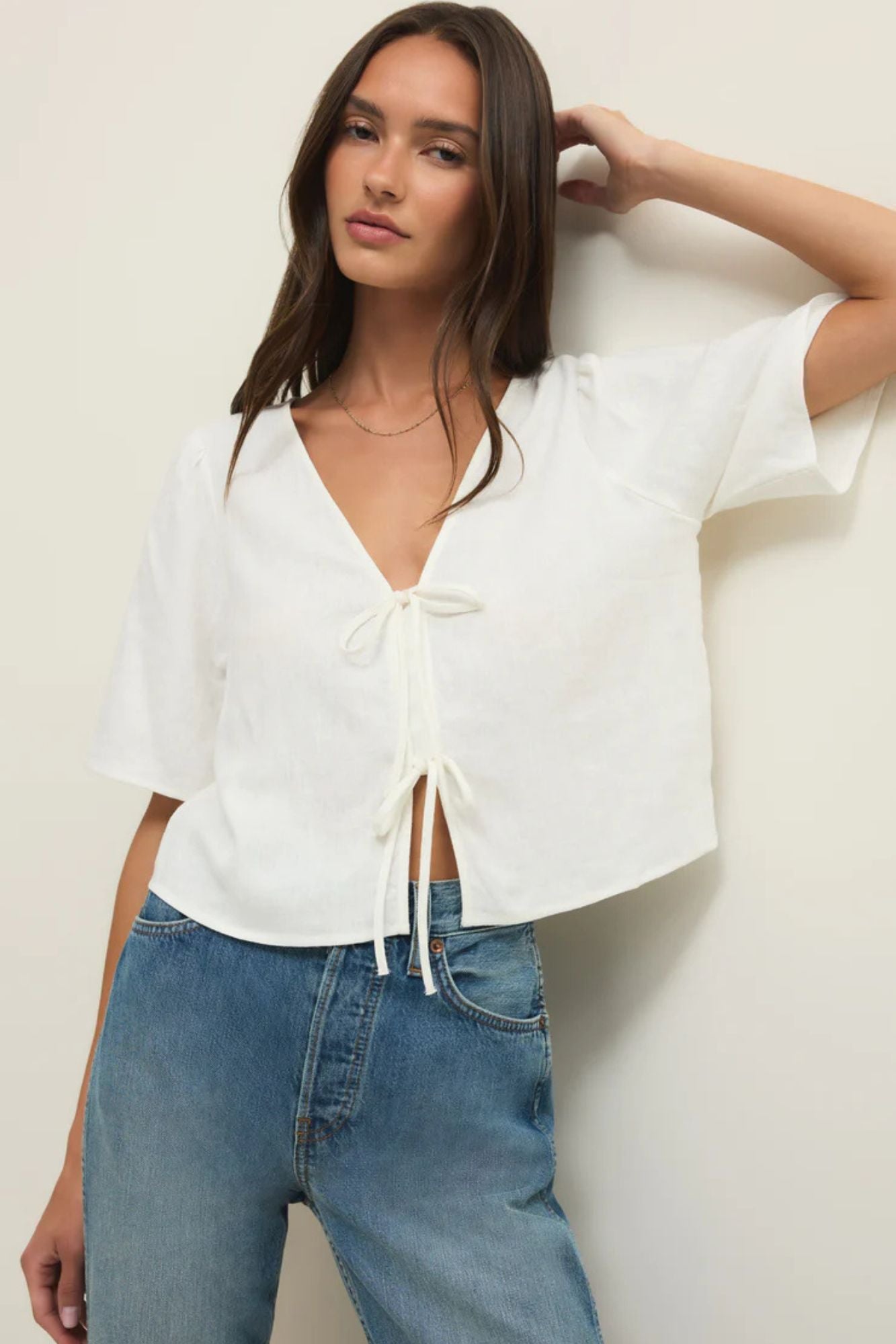 Effortlessly chic, the La Belle Linen Top combines a soft washed linen blend with a relaxed silhouette and charming tie front. The integrated modesty placket ensures comfortable coverage while the versatile design transitions seamlessly from casual to dressed-up looks. Perfect paired with denim or linen pants for an understated, polished aesthetic.