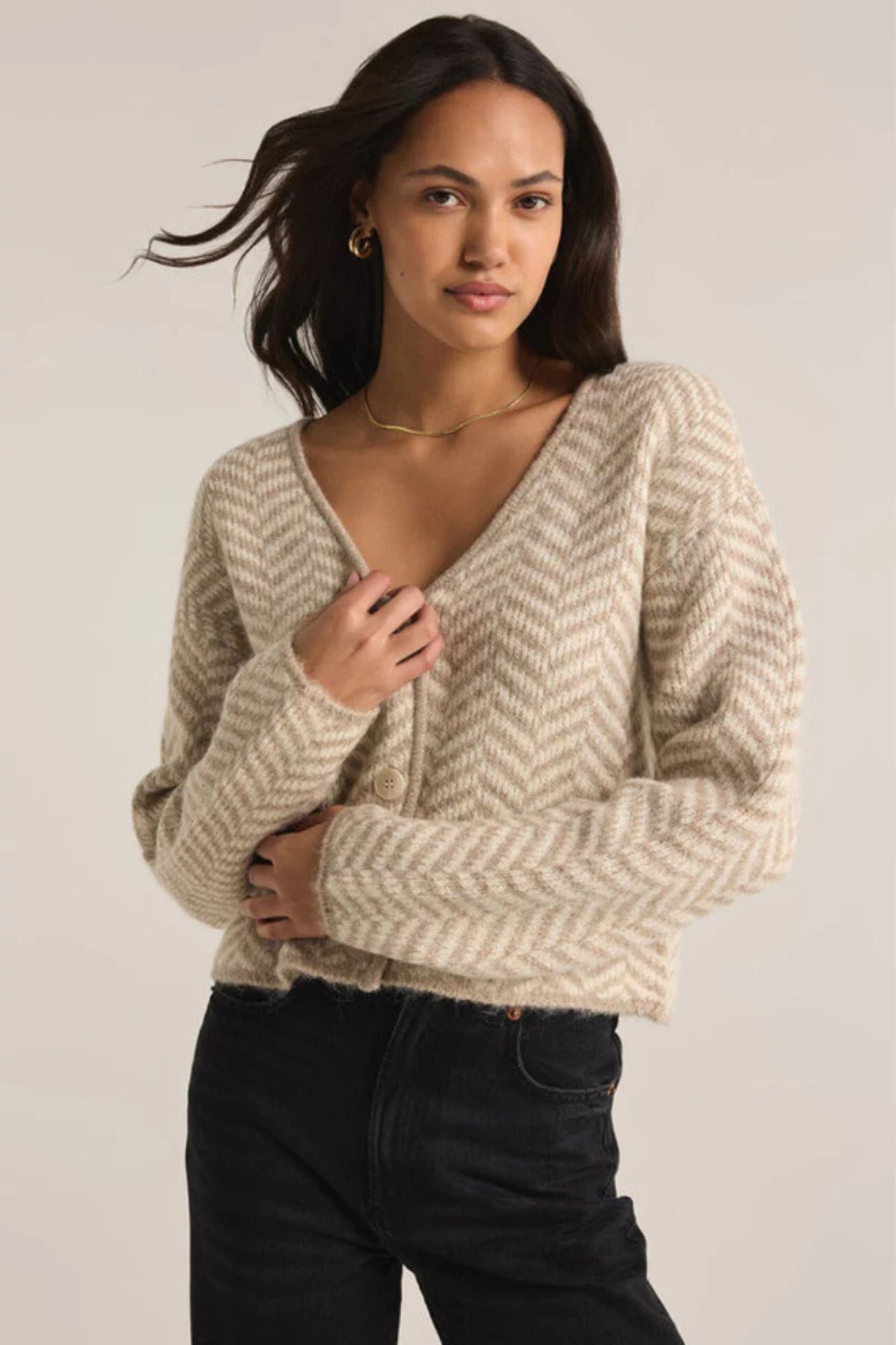 Cozy up in vintage style with the Naomi Herringbone Cardigan. Made with soft mohair, this cardigan features a classic v-neck, faux horn buttons, and herringbone jacquard stitching for a timeless touch. Perfect for adding an extra layer of warmth and style to any outfit.