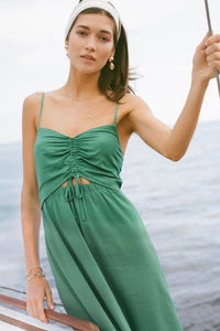 Take on the day with effortless style in the Winslet Maxi Dress. Made with airy rayon linen fabric, this breezy v-neck dress features adjustable spaghetti straps and a playful front cutout with a tie detail. The botanical green color adds a touch of nature-inspired beauty, while the regular fit and flowy silhouette make it perfect for any body type. Embrace the sun in this versatile and stylish maxi dress.