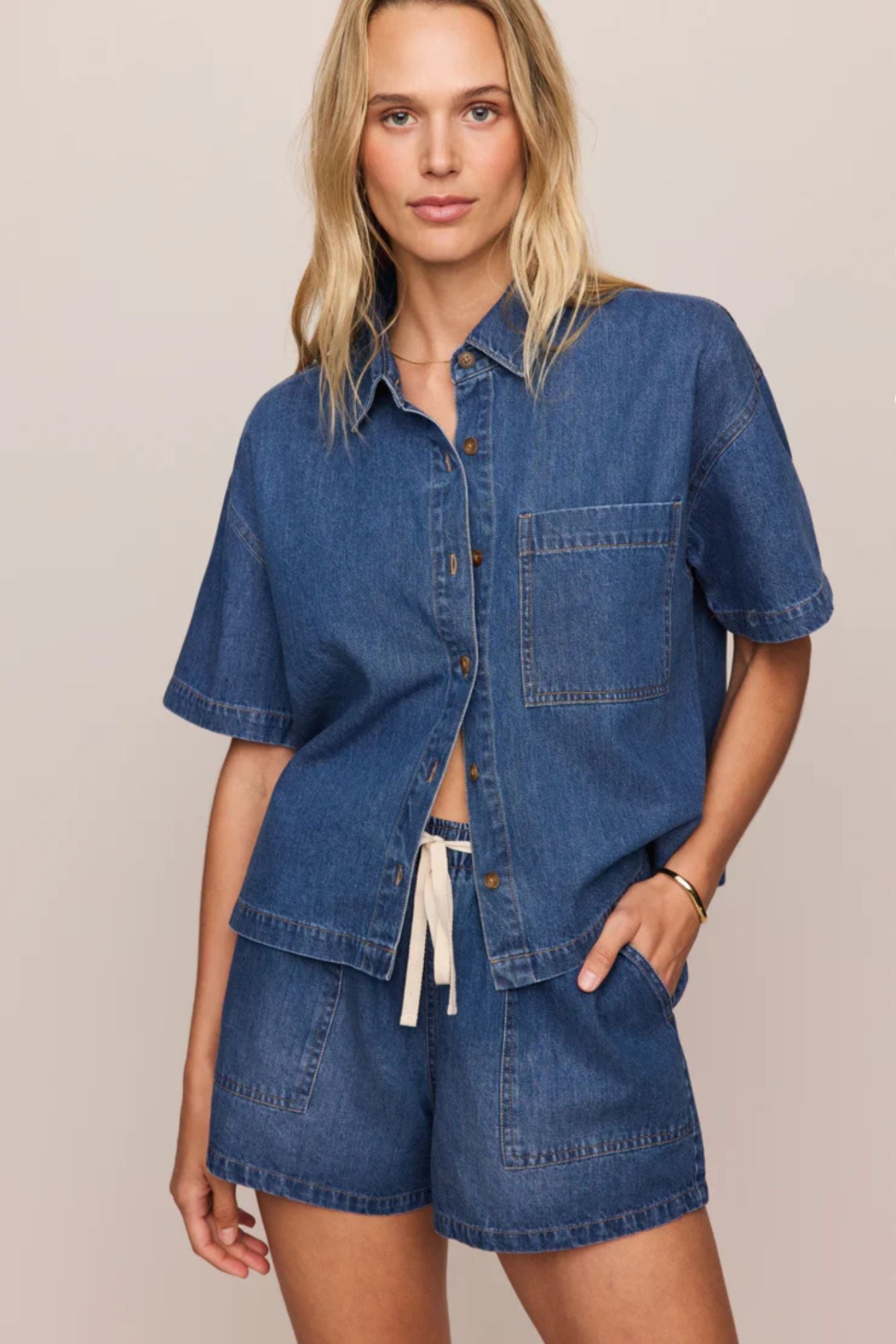 Crafted from 100% cotton, these utility shorts deliver a timeless denim aesthetic with an irresistibly soft, relaxed fit. The elastic waistband ensures all-day comfort, while patch pockets add practical style. Lightweight and versatile, they pair seamlessly with everything from coordinating tops to simple tanks, making them the perfect addition to any wardrobe.